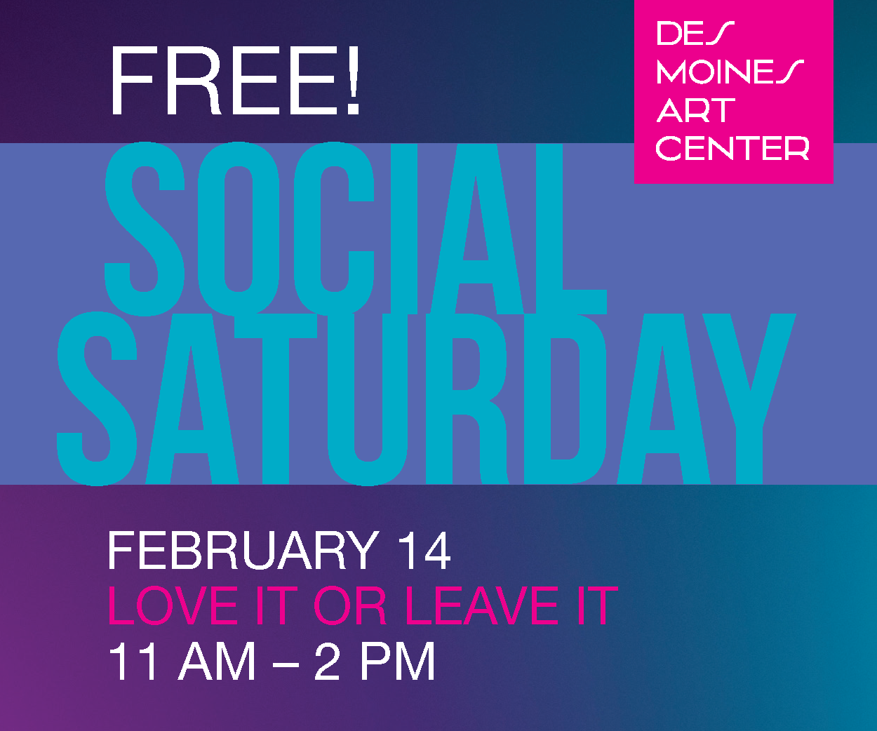 Join the Des Moines Art Center’s February Social Saturday event: Love it or Leave it! Whether you’re a fan of vibrant abstract paintings, or prefer minimalist artwork, there is something for everyone throughout the galleries. We invite you to engage in conversations about the art that inspires you — those pieces that speak to your heart — and those that challenge you — that you might just want to leave behind. Come dressed in festive reds and pinks or somber blacks and grays in celebration of the duality of the day. Join in on the interactive “Hearts for Art” activity by leaving a heart at the foot of your favorite piece in the museum and explore to see what your fellow guests have chosen as theirs. Enjoy crafts in the Art School studios, a free guided tour, treats in the Café and so much more!
