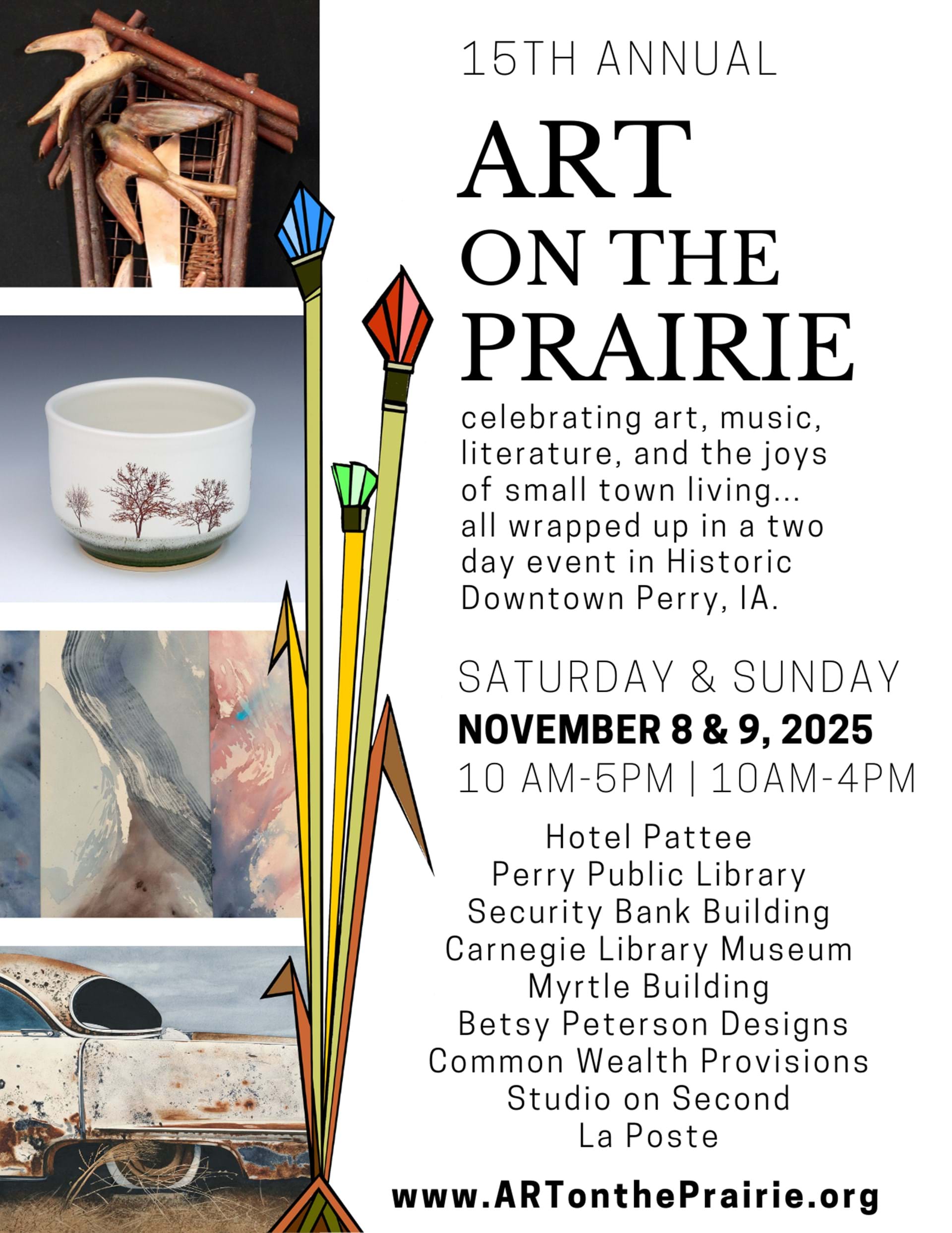 The 15th Annual Art on the Prairie Festival returns to downtown Perry, IA - in 9 historic venues - to bring together a celebration of Visual Art, Live Music, and Poetry! Saturday, November 8th (10 a.m.-5 p.m.) Sunday, November 9th (10 a.m.-4 p.m.) 48+ Visual Artists 36+ Musicians 16+ Poets 2025 Festival Venues: - Perry Public Library | 1101 Willis Ave - Security Bank Building | 1102 Willis Ave - Hotel Pattee | 1112 Willis Ave - Carnegie Library Museum | 1123 Willis Ave - Myrtle Building | 1020-1024 2nd Street - Betsy Peterson Designs | 1121 2nd Street - Common Wealth Provisions | 1215 2nd Street - Studio on 2nd | 1218 2nd Street - La Poste | 1219 Warford Street Visual Artist Booths & Acoustic Music in ALL Venues, plus: Featured Artists in The Cellar of La Poste Poetry on the Prairie in the Community Room of the Perry Public Library Hands-on Activity at Multiple Venues View digital program with schedule of activities and artist previews: www.artontheprairie.org