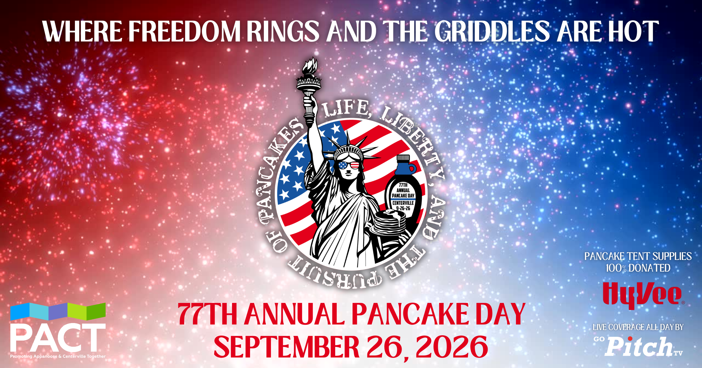 Make plans to visit Centerville for one of Iowa’s most delicious and beloved traditions! Pancake Day is a two-day, family-friendly festival that draws visitors from across the Midwest for small-town charm, big smiles, and—yes—free pancakes served throughout the day. Held each fall in historic downtown Centerville, the celebration features a festive parade, live entertainment, kids’ activities, local vendors, and plenty of classic festival fun. Whether you’re cheering on the parade, exploring the downtown square, or stacking your plate with fluffy pancakes, there’s something happening all day long for visitors of every age. In 2026, the 77th Annual Pancake Day celebrates America 250 with a patriotic theme, Life, Liberty & the Pursuit of Pancakes, making it a perfect excuse to plan a fall getaway to Appanoose County. Come for the pancakes, stay for the community, and experience a tradition that’s been bringing people together for generations.