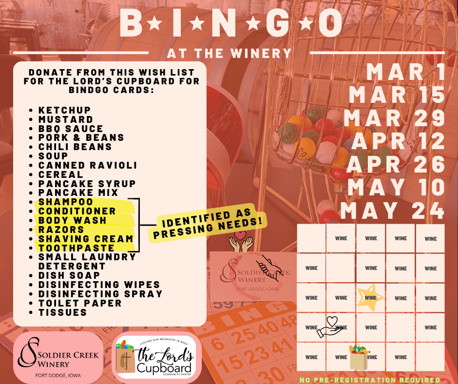 Bingo! Bring your friends, family, neighbors for a *good cause* and some fun! Select Sundays from 3-5PM. We are partnering with The Lord's Cupboard, donate items off of their wish list or cash donation in exchange for bingo cards: ketchup, mustard, bbq sauce, pork & beans, chili beans, soup, canned ravioli, cereal, pancake syrup, pancake mix, shampoo, conditioner, body wash, razors, shaving cream, toothpaste, small laundry detergent, dish soap, disinfecting wipes, disinfecting spray, toilet paper, tissues. There are fabulous wine prizes for winners, so grab some things off of the wish list and scoot your booty over here! We will play 4 rounds of regular BINGO, then 1 round of blackout BINGO. Winners of the regular rounds get 1 free glass of wine + a surprise prize. The winner of the blackout round gets a bottle of wine! Mark your calendar!