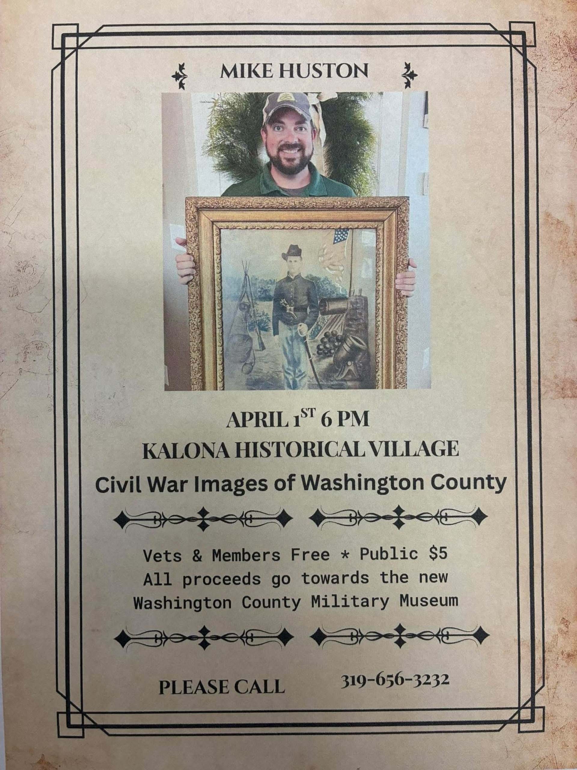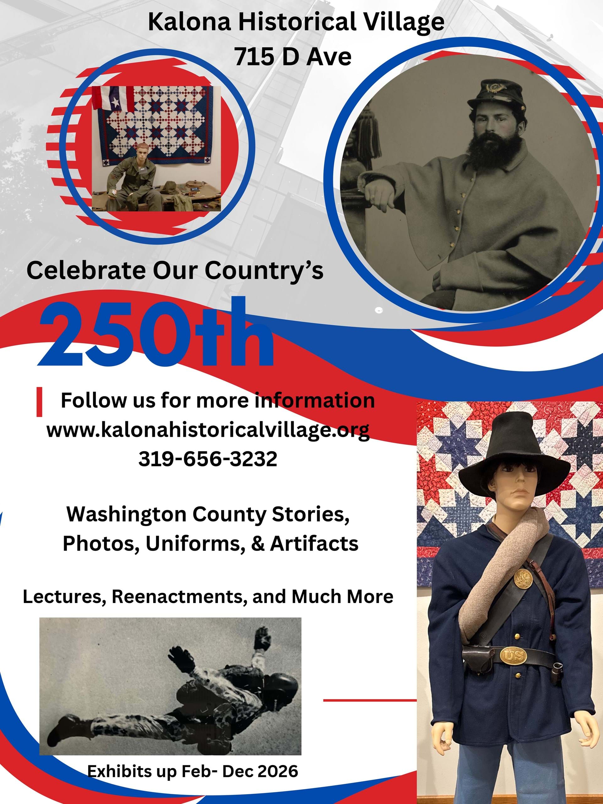 Come Join Us in Celebrating Our Country's 250th!!! Washington County Stories, Photos, Uniforms, and Artifacts! Lectures, Reenactments, and MUCH much MORE! Exhibits are on display February-December 2026 Follow us for more information: www.kalonahistoricalvillage.org Ph: 319-656-3232