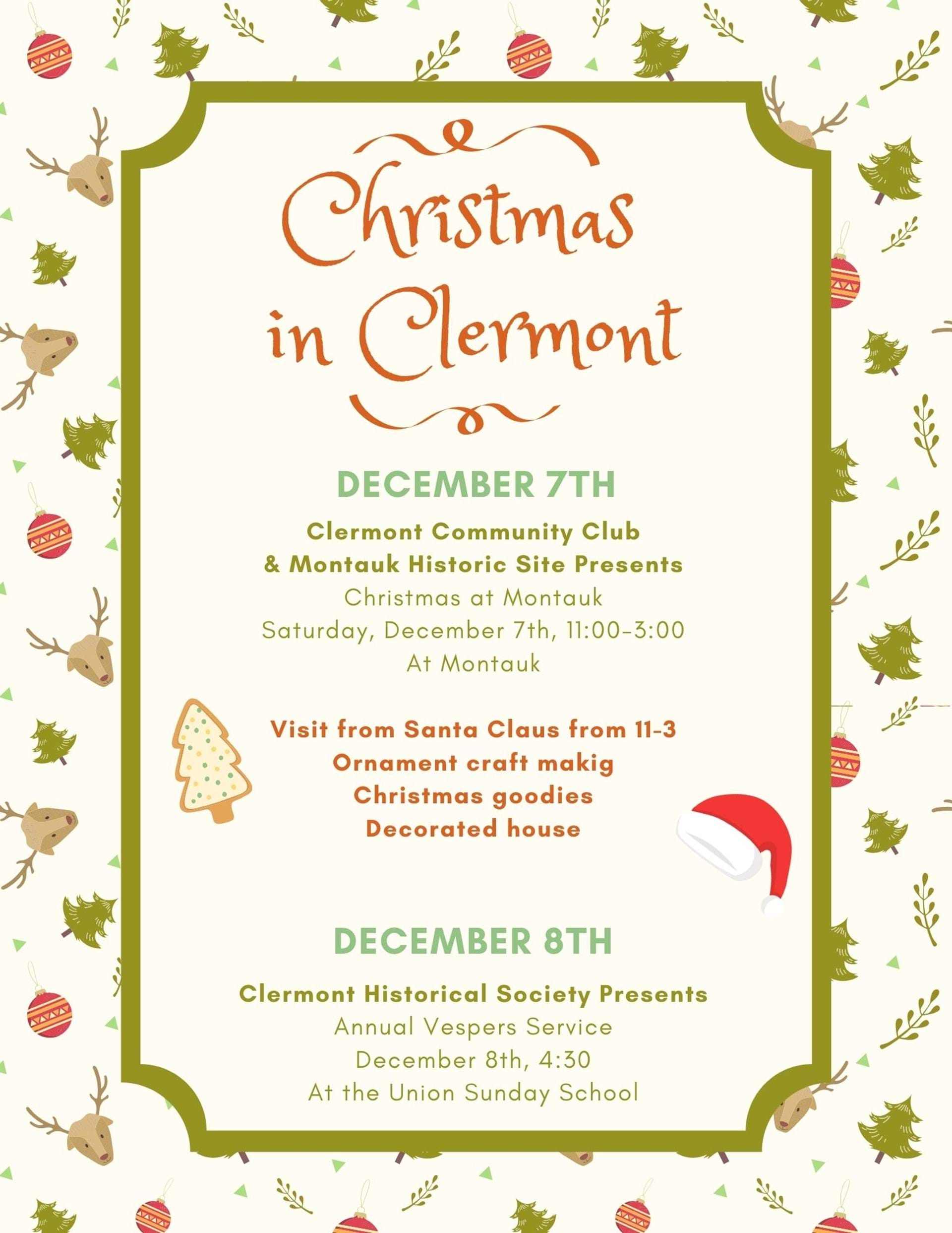 Montauk Historic Site and the Clermont Community Club invites all to a Holiday Open House at Montauk. The house will be decorated and open to walk through, along with hot cider and Christmas goodies to eat. We will have a Christmas ornament craft for the kids and Santa will be here from 11-3. Come enjoy some Christmas fun at Montauk!