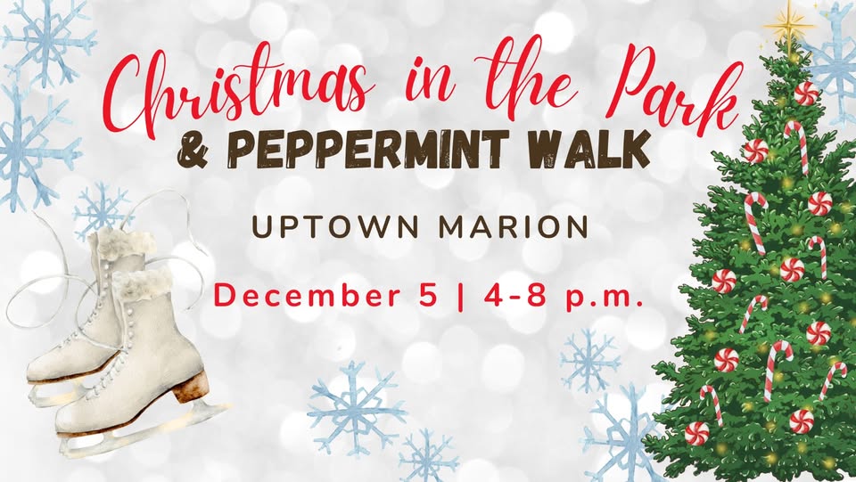 Family Fun in Marion with Christmas in the Park and Peppermint Walk! Join us for this annual celebration the first Friday in December in City Square Park and Uptown Marion. We will welcome Santa and Mrs. Claus escorted by the Marion Fire Department and Police Department. Marion will shine bright this holiday season with the lighting of the community peace tree at 6 p.m. Visit Santa and Mrs. Claus and enjoy music from area choirs. Enjoy traditional event activities including popcorn from El Kahir Shrine and hot cocoa while supplies last. Bring a new, warm-weather item to place inside and help Keep Your Neighbors Warm. ? Visit participating Uptown Marion merchants for the Peppermint Walk. Stores will be decked with holiday lights, decorations and music making this a great compliment to the Park activities.