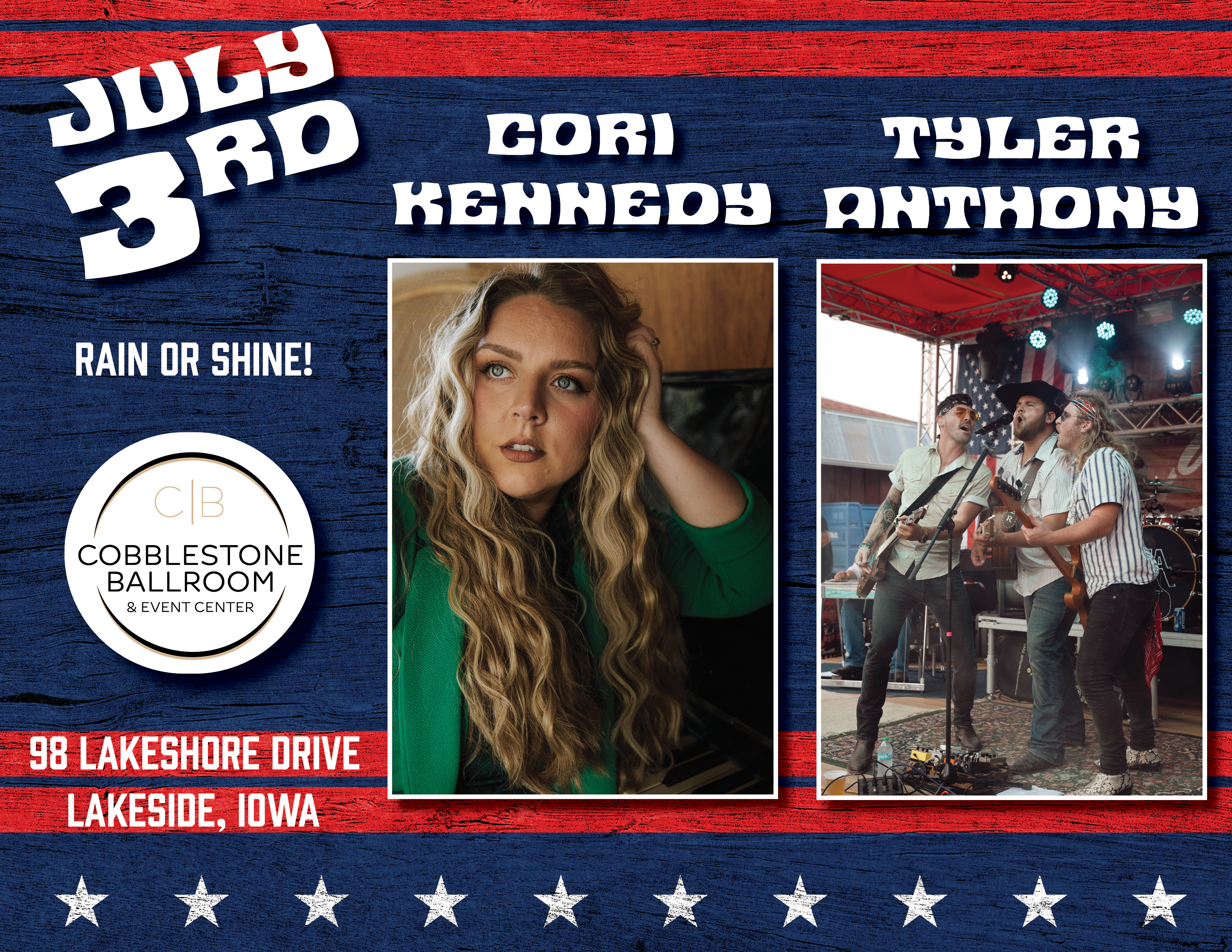 Friday, July 3rd, 2026 live at Cobblestone Ballroom & Event Center is Cori Kennedy & Tyler Anthony Band. Indoor concert - rain or shine event. Tickets on sale in the spring.