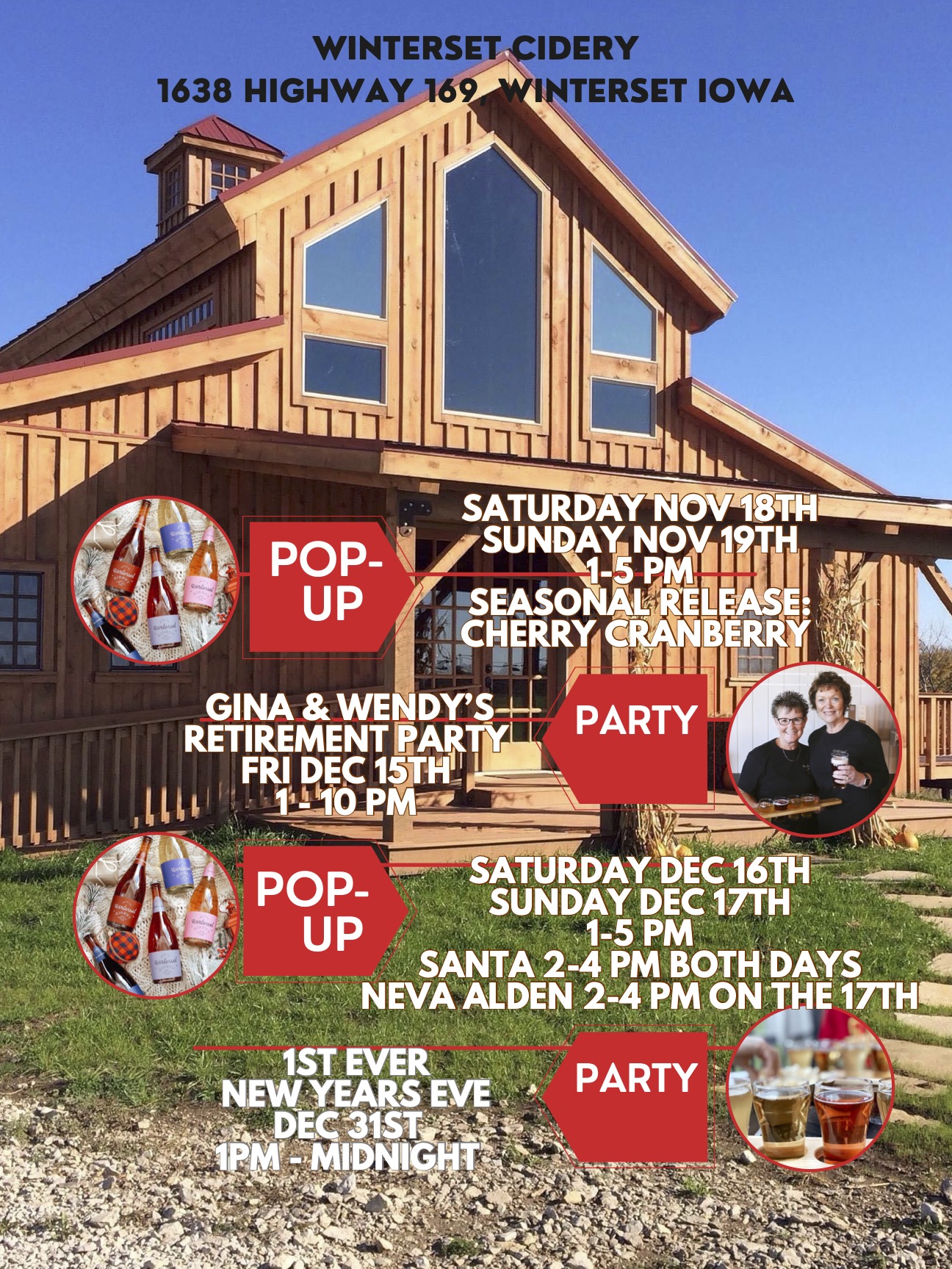 Come join us for our December Pop-up; Saturday December 16th and Sunday Dec 17th 1-5 p.m. Santa will be present both days 2-4 p.m. and Neva Alden will perform Sunday December 17th 2-4 p.m. Bring the kids, sip some cider, then take a bottle, crowlers, or bring your own growler home for the holidays! Hope to see you there!
