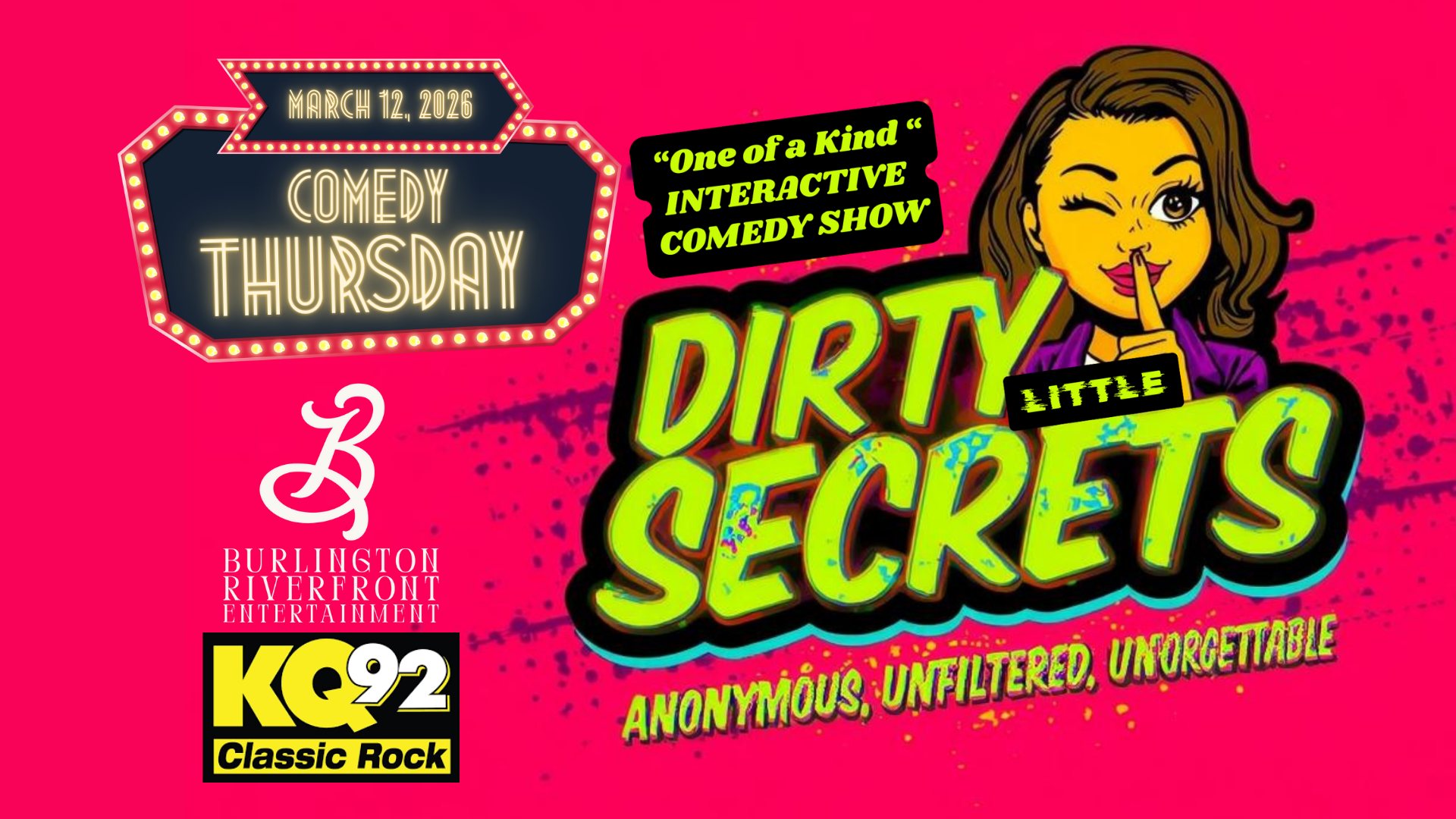 Dirty Little Secrets is a crowd-driven comedy experience built around anonymous audience submissions that Melissa & Doug read and riff on from the stage. There are no volunteers, no pressure on the crowd, and every show is completely different. The result is a room that feels engaged, safe, and laughing together from start to finish! Bring your spouse, your sisters, your frenemies ... and your secrets! Who knows - maybe one of the jokes is on YOU. Tickets start around $15 with table seating options available.
