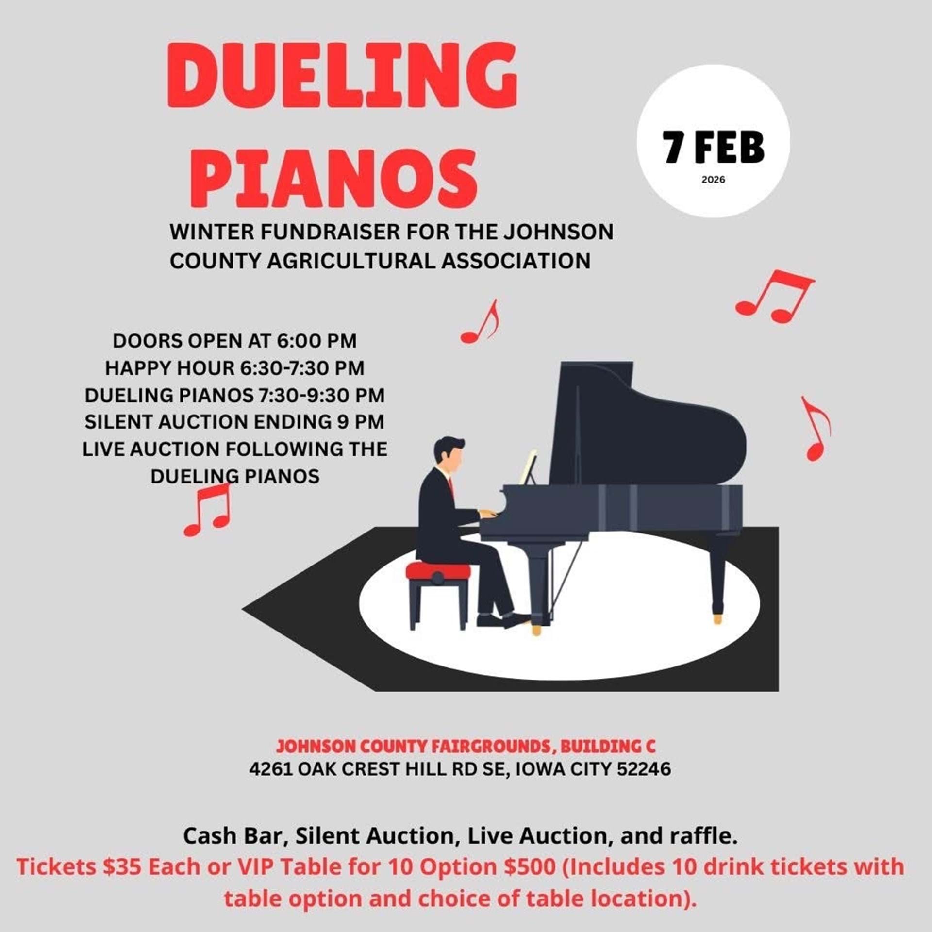 Get ready for a fun-filled evening at the Dueling Pianos - Winter Fundraiser supporting the Johnson County Agricultural Association! Enjoy live, in-person piano battles where your favorite tunes come to life with humor and energy. Bring your friends, sing along, and help us support a great cause while having a blast. We'll also have a cash bar, raffle, and silent and live auction items. Tickets may be purchased at: thejohnsoncountyfair.com Don’t miss this unforgettable night of music and community spirit!