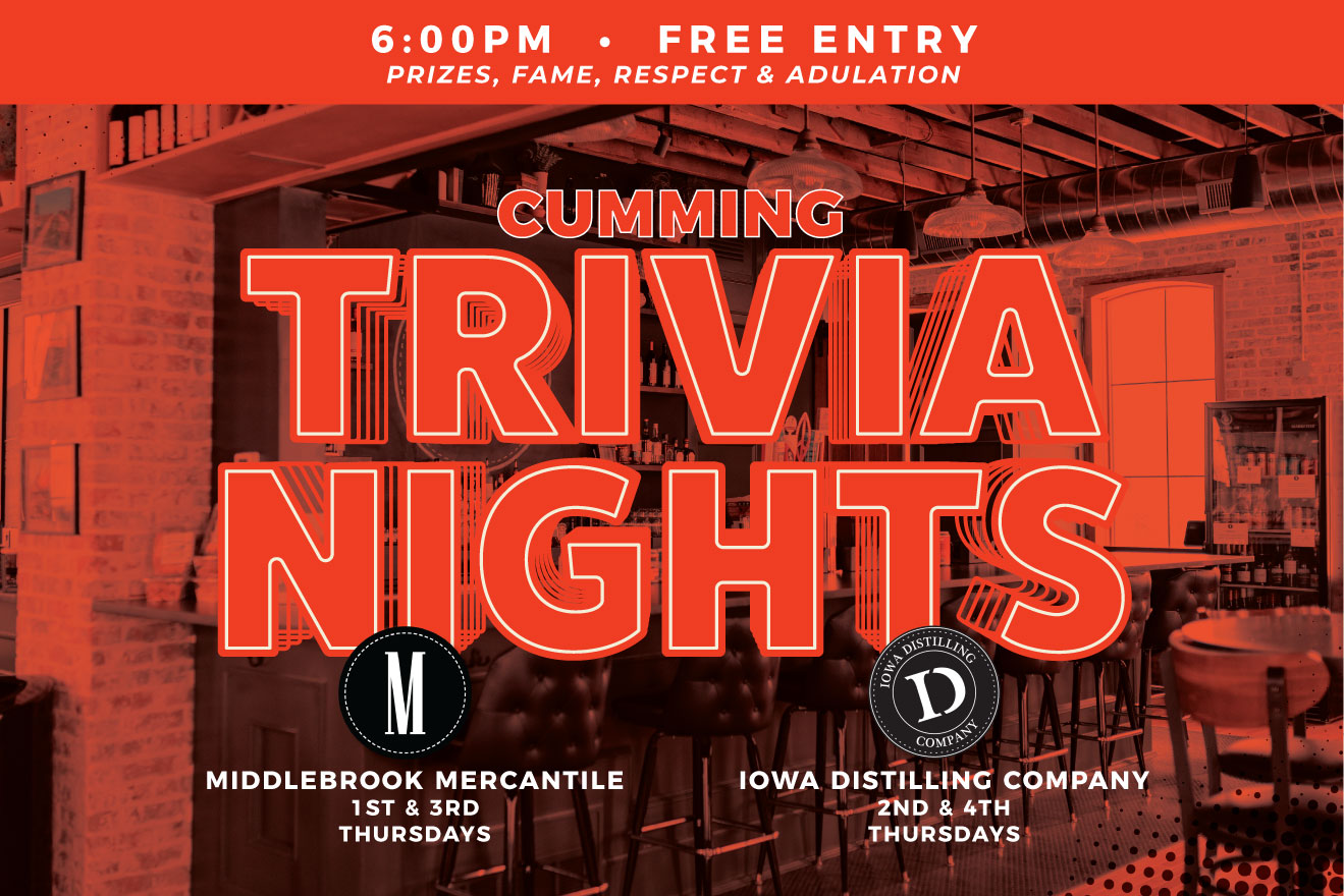 Looking for a fun Thursday night out with your favorite Trivia caller, Robert? Join us for Trivia Nights in Cumming, every week at two fantastic locations: 1st and 3rd Thursdays: The Merc 2nd and 4th Thursdays: Iowa Distilling Company Time: 6:00 PM Entry: Free Compete for exciting prizes, fame, respect, and adulation. Form a team, challenge your brain, and enjoy a night of friendly competition and community fun. Don’t miss out—see you there!