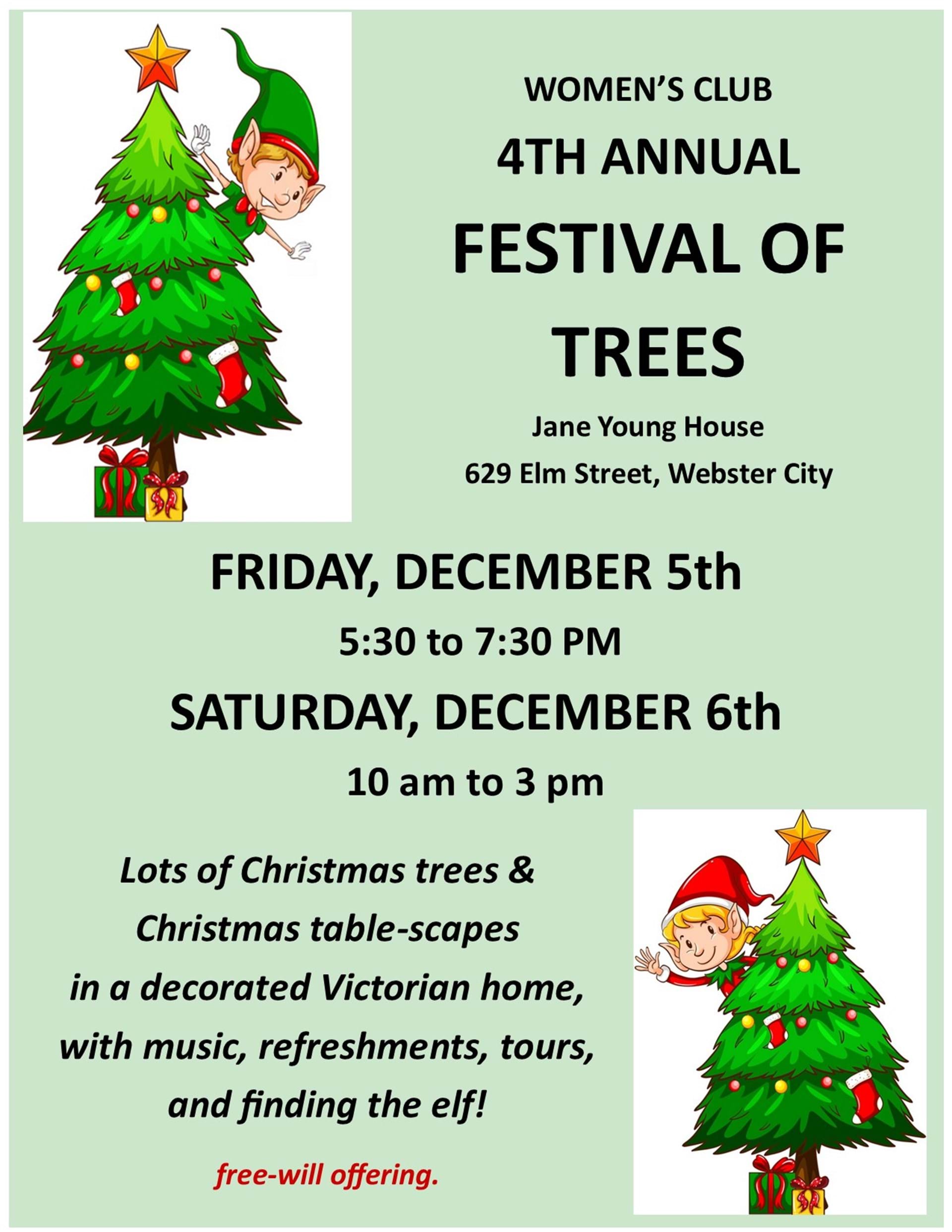 The Women's Club invites you to its 4th Annual Festival of Trees during Webster City's "Christmas in the City." The beauty of the lighted trees, holiday decorations, and the historic Jane Young House will be on display Friday, December 5, 5:30-7:30 p.m. Enjoy a glass of wine, crackers and cheese during your visit. Visitors are also welcome to stop by Saturday, December 6, 10 a.m.-3 p.m. Take home ideas and a bag of refreshments. Be sure to check out the second floor exhibit, "Let's All Go to the Movies." Free will offerings are appreciated.