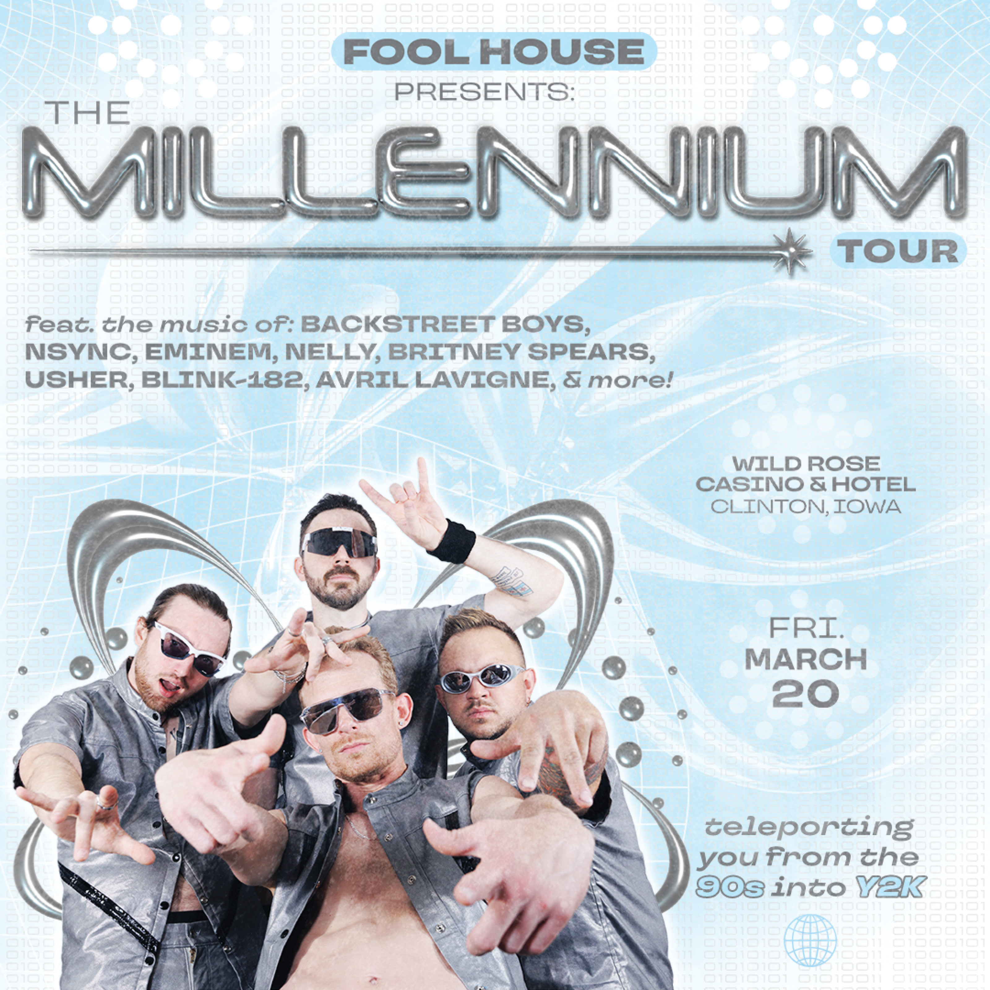 Wild Rose Casino & Hotel is thrilled to present Fool House – The Ultimate 90’s Party: The Millennium Tour on Friday, March 20, 2026, in the Oakwood Grand Ballroom. Fool House - The Ultimate 90’s Party is bringing you the 90’s VMA’s Tour including music from NSYNC, Backstreet Boys, Eminem, Britney Spears, Madonna, Spice Girls & more! The Millennium Tour is a TOTALLY EPIC 90s & 2000s THROWBACK PARTY! Get ready to relive the glory days of frosted tips, flip phones, and fire playlists. Grab your crew and get down with Fool House for The Millennium Tour - the ULTIMATE 90s & Y2K - themed live show experience that’ll have you partying like it’s 1999! The Millennium Tour includes: VIP red carpet photo op (Y2K fashion STRONGLY encouraged) ; Pre-show pop culture trivia to test your retro knowledge; Pre-show party with curated playlist and video to get you HYPE; Full band taking you from the 90s into the early 2000s with ALL THE HITS; Massive balloon drop finale to blow the roof off Tickets are $20 + tax/fees and are available for purchase at the Iowa Store Box Office or online at www.wildroseresorts.com. You may add your concert ticket + a VIP Fab Club merch package! For $50, you will receive your concert ticket + a fanny pack, koozie, light up scrunchie, slap bracelet, sunglasses and exclusive VIP credential with lanyard. Limited quantities available. Doors will open at 7:00 p.m., DJ to get the party started at 7:30 p.m. and The Ultimate 90’s experience starts at 8:00 p.m. Must be 21+.