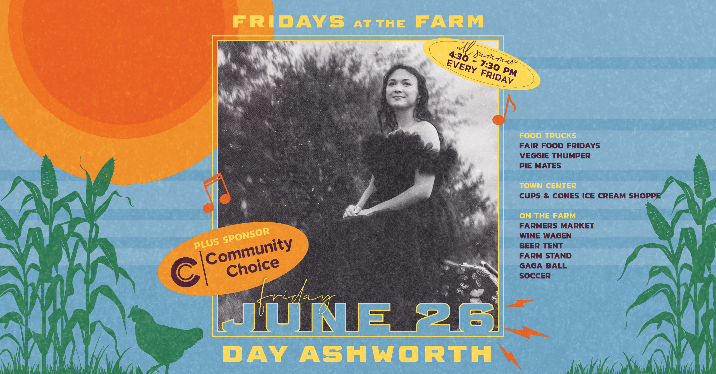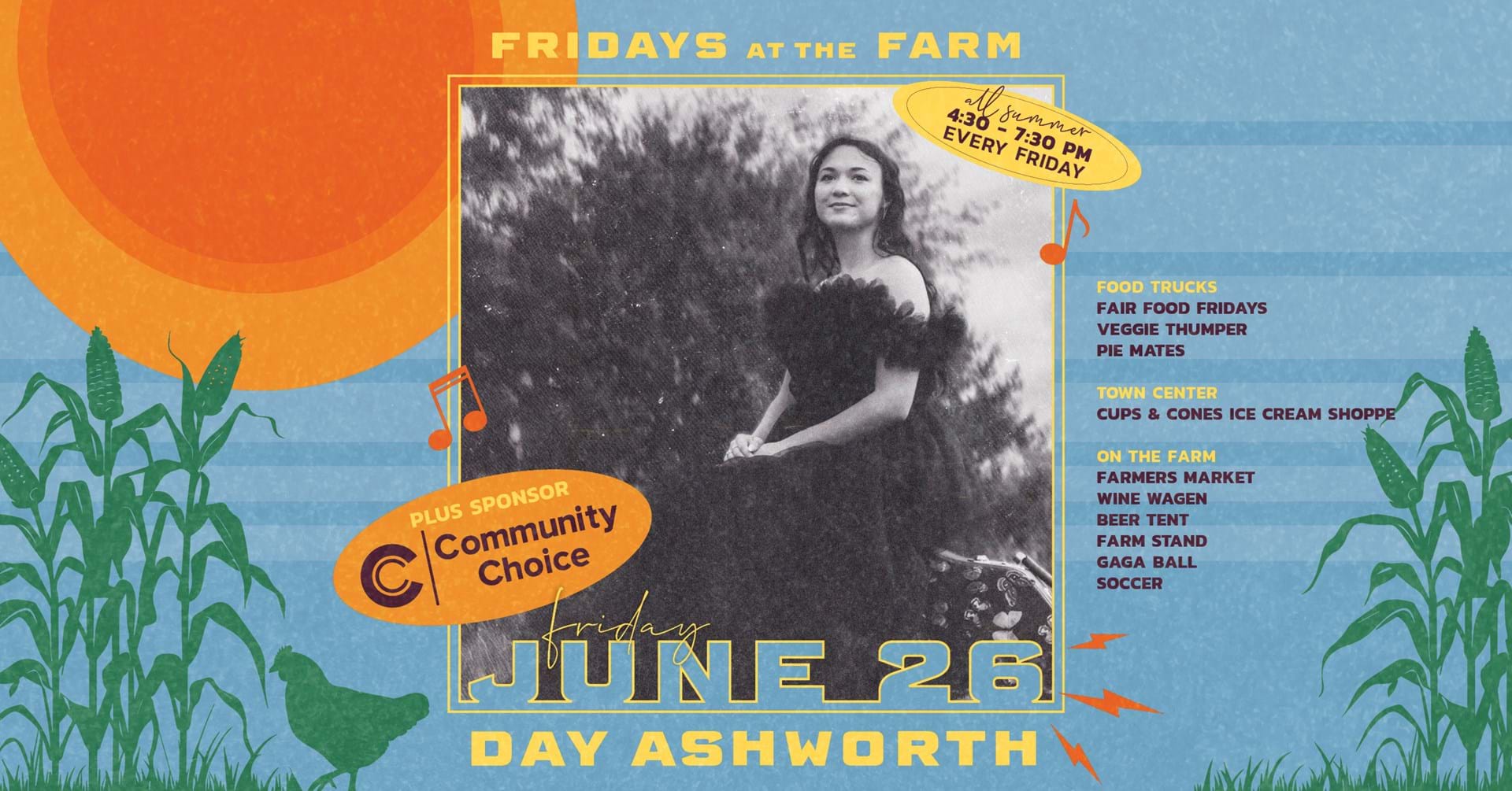 Enjoy live music on The Farmhouse porch, browse our local vendor market, and grab a bite from some of your favorite food trucks. Bring a lawn chair or blanket, sip something refreshing from the Wine Wagen or beer tent, and settle in for a relaxed, feel-good Friday evening under the open sky. Plus, there’s fun for the kids, too, with activities like soccer and gaga ball to keep them moving while you kick back and enjoy the night. Friday, June 26 | 4:30 – 7:30 PM Live Music: Day Ashworth Food Trucks: Fair Food Fridays, Veggie Thumper, Pie Mates Free, family-friendly, and full of summer vibes—see you at the Farm!
