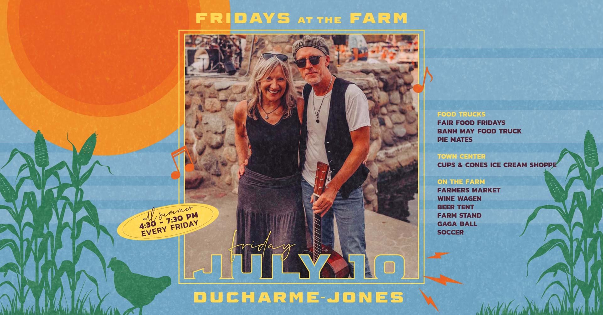 Enjoy live music on The Farmhouse porch, browse our local vendor market, and grab a bite from some of your favorite food trucks. Bring a lawn chair or blanket, sip something refreshing from the Wine Wagen or beer tent, and settle in for a relaxed, feel-good Friday evening under the open sky. Plus, there’s fun for the kids, too, with activities like soccer and gaga ball to keep them moving while you kick back and enjoy the night. Friday, July 10 | 4:30 – 7:30 PM Live Music: Ducharme-Jones Food Trucks: Fair Food Fridays, Banh May Food Truck, Pie Mates Free, family-friendly, and full of summer vibes—see you at the Farm!