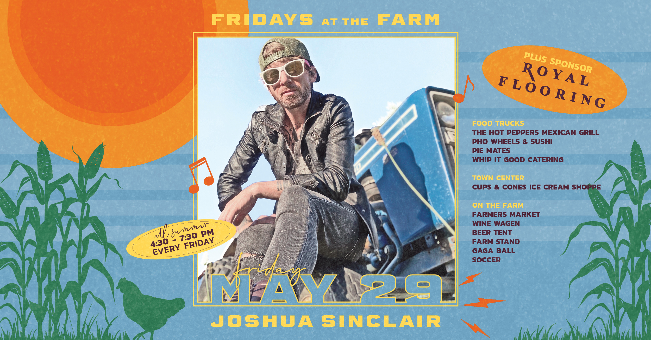 Enjoy live music on The Farmhouse porch, browse our local vendor market, and grab a bite from some of your favorite food trucks. Bring a lawn chair or blanket, sip something refreshing from the Wine Wagen or beer tent, and settle in for a relaxed, feel-good Friday evening under the open sky. Plus, there’s fun for the kids, too, with activities like soccer and gaga ball to keep them moving while you kick back and enjoy the night.Friday, May 29 | 4:30 – 7:30 PM Live Music: JOSHUA SINCLAIR Food Trucks: The Hot Peppers Mexican Grill, Pho Wheels & Sushi, Pie Mates Free, family-friendly, and full of summer vibes—see you at the Farm!