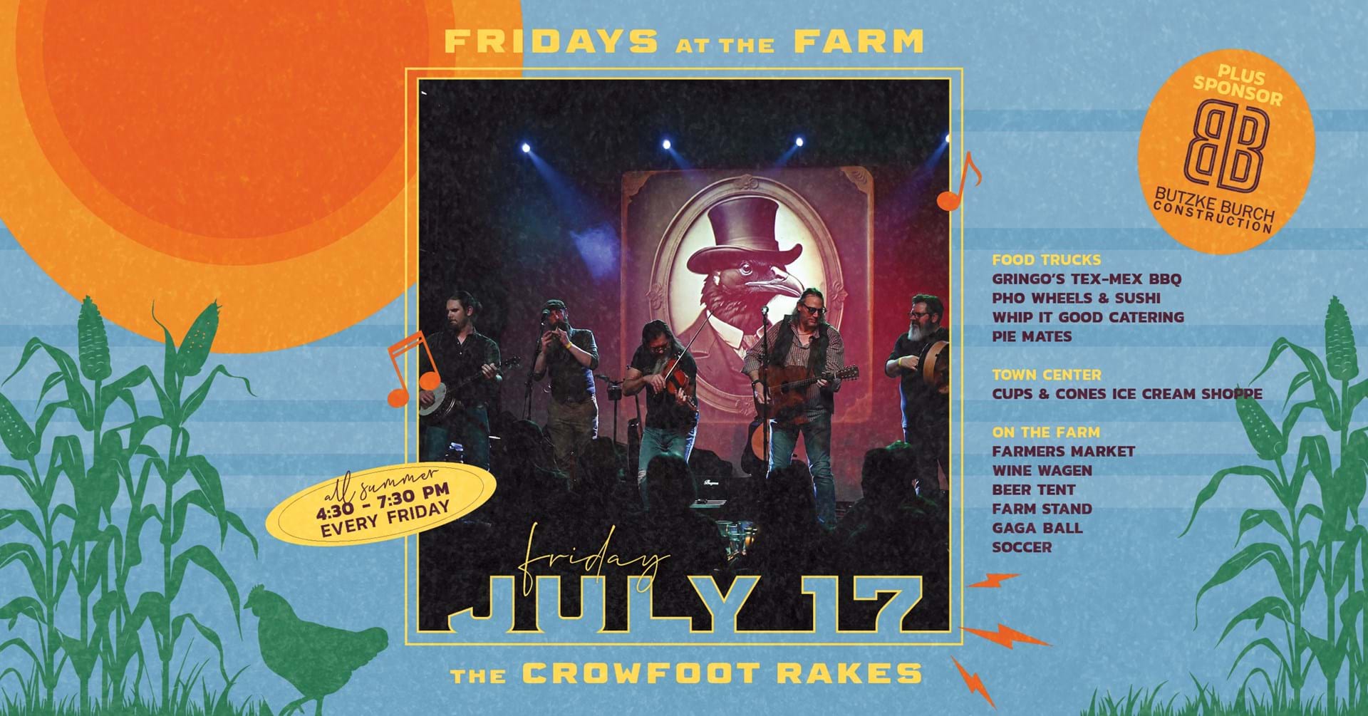 Enjoy live music on The Farmhouse porch, browse our local vendor market, and grab a bite from some of your favorite food trucks. Bring a lawn chair or blanket, sip something refreshing from the Wine Wagen or beer tent, and settle in for a relaxed, feel-good Friday evening under the open sky. Plus, there’s fun for the kids, too, with activities like soccer and gaga ball to keep them moving while you kick back and enjoy the night. Friday, July 17 | 4:30 – 7:30 PM Live Music: The Crowfoot Rakes Food Trucks: Gringo’s Tex-Mex BBQ, Pho Wheels & Sushi, Pie Mates Free, family-friendly, and full of summer vibes—see you at the Farm!