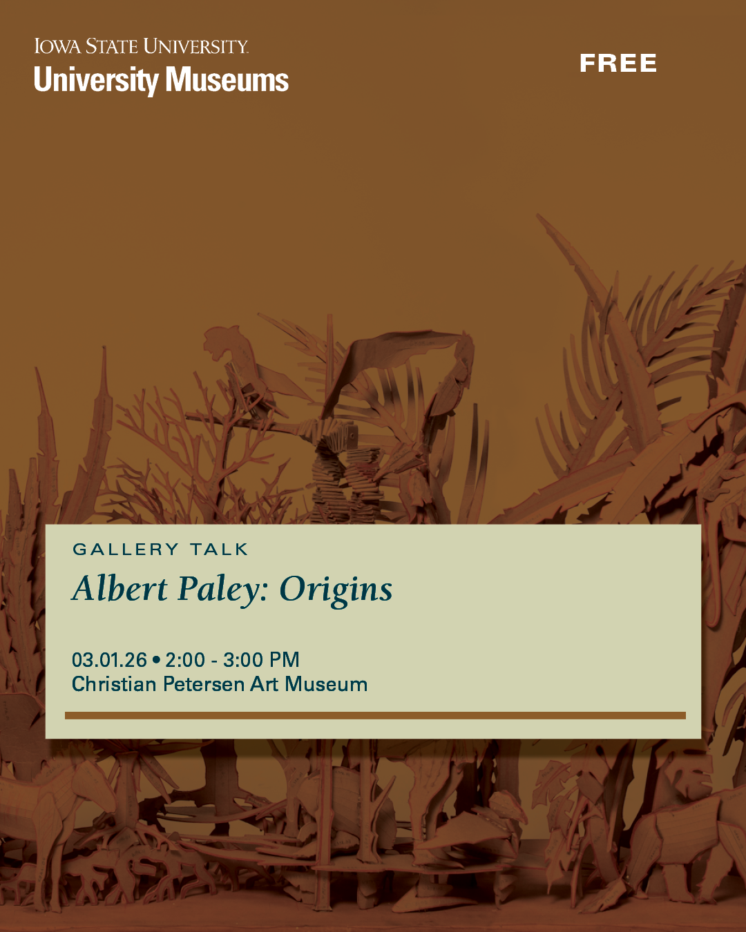 Discover the work of internationally recognized metal sculptor Albert Paley in this free guest lecture. Anne Pagel, Curator of the Karen and Robert Duncan Art Collection, explores how Paley transforms metal into bold, evolving sculptures that investigate form, materials, and innovation. Learn how his sculptures create a dynamic dialogue between art and architecture in public spaces, including Iowa State’s own Transformation, a public art installation at the east entrance of Morrill Hall. Presented in conjunction with the exhibition Albert Paley: Origins, on loan from the Clarinda Carnegie Art Museum, Pagel will share insights from her curatorial research and discuss her recently published book of the same title. Books will be available for purchase and signing. Albert Paley: Origins is on view at the Christian Petersen Art Museum, March 1–July 24, 2026. Support for this program was provided by the Kathy & John Howell Art Enrichment Program.