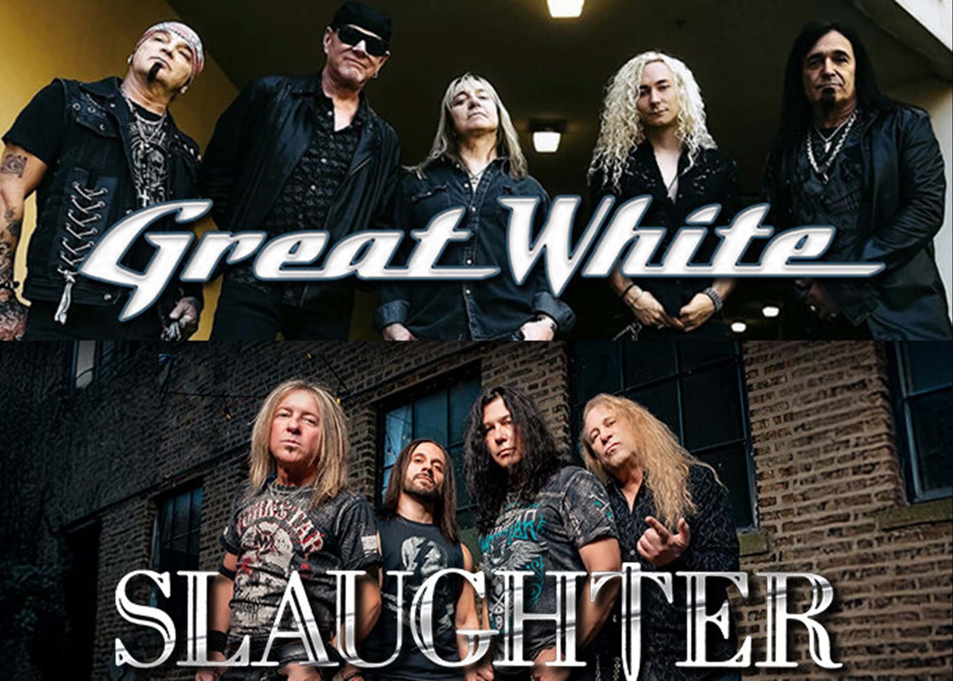 Great White: For a band to continue to thrive for 40 years in the music business, the mantra must be, these songs are bigger than any one member. GRAMMY-nominated hard rock legends Great White are adding onto that line with the saying: expect the unexpected. It's rock and roll, baby. Great White's ride runs deep, and its passion for the music goes beyond any depth. Four decades in, Great White enlists Brett Carlisle to take over vocal duties and lead the charge on hit after hit. That arsenal of songs includes the GRAMMY-nominated Best Hard Rock Performance hit, "Once Bitten, Twice Shy." To experience their hits, live in concert - "Rock Me," "Mista Bone," "Save Your Love," "House of Broken Love," and "Lady Red Light" - is to ride an emotional wave of sultry connections, arousing lyrics, and an all -out marathon of hard-hitting orchestrations. Slaughter: In 1990, Slaughter hit radio, MTV, and the U.S. touring circuit like a tornado - coming seemingly out of nowhere to roll through everything in its path and turn it upside down. Touring the world with bands that they loved, Kiss, Ozzy, and others meant the good times were just a song away, and their first hit single, "Up All Night" certainly fit into that mold, their second chart-topper, "Fly to The Angels" was more representative of the spirituality awareness that goes into most of the band's music and lyrics. But never was Slaughter more accurately represented than live onstage in front of their legions of devoted fans.