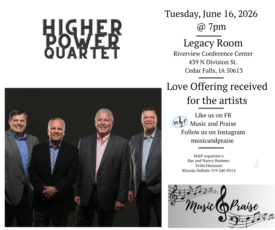 Higher Power is a quartet from central Iowa that sings southern Gospel, traditional, progressive, and a cappella style songs at church services, community events, and other special events. Higher Power are well-known and a favorite in the Cedar Valley. Read more at hpqministries.com