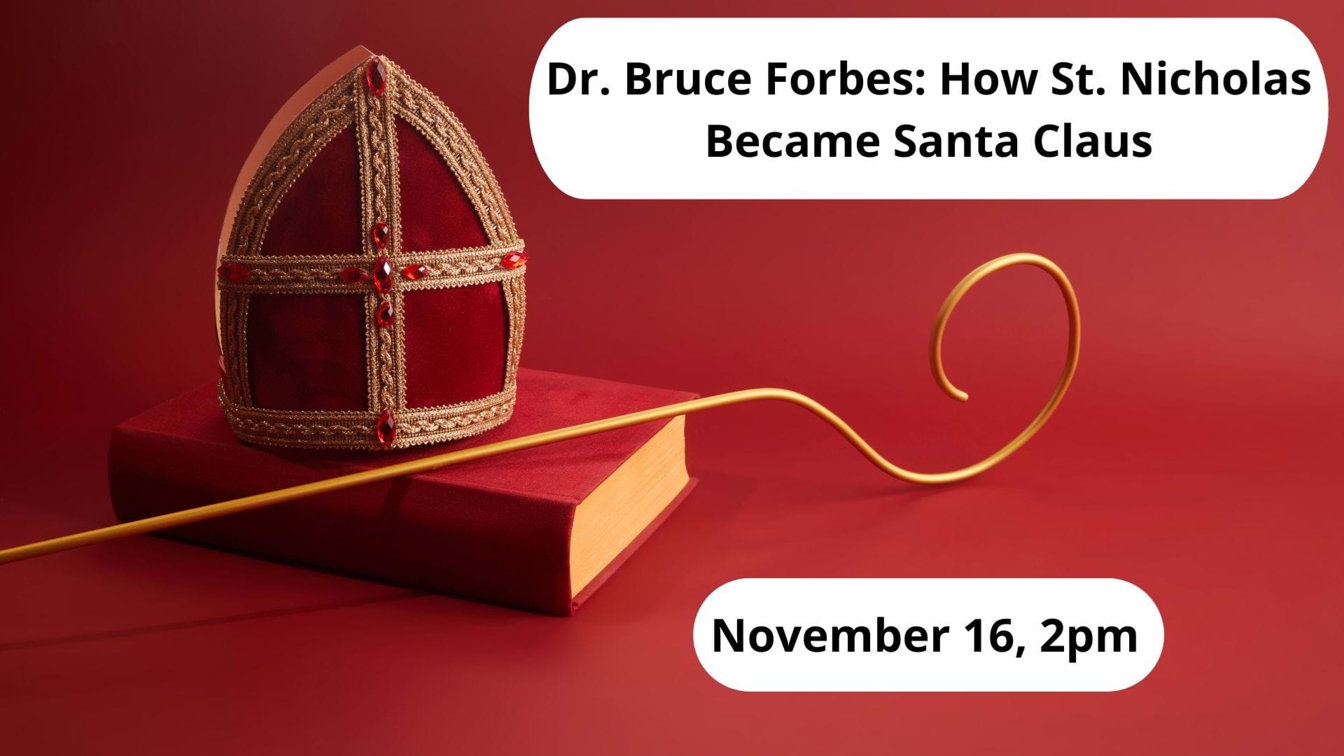 On Sunday, November 16, 2025, at 2:00 p.m., the Betty Strong Encounter Center welcomes Dr. Bruce Forbes, Professor Emeritus of Religious Studies, Morningside University. Admission is free, but freewill donations encouraged. While it’s not quite the Christmas season, Christmas decorations and advertising are already everywhere. So why not have a talk on “How Saint Nicholas Became Santa Claus.” Forbes formal academic training is in the history of Christianity, but he has also developed a special interest in the analysis of popular culture. Forbes is a former department chair and professor of religious studies at Morningside College in Sioux City, Iowa. He is the co-editor of two books: Religion and Popular Culture in America, co-edited with Jeffrey H. Mahan, and Rapture, Revelation and the End Times: An Exploration of the Left Behind Series (2004), co-edited with Djeanne Halgren Kilde.