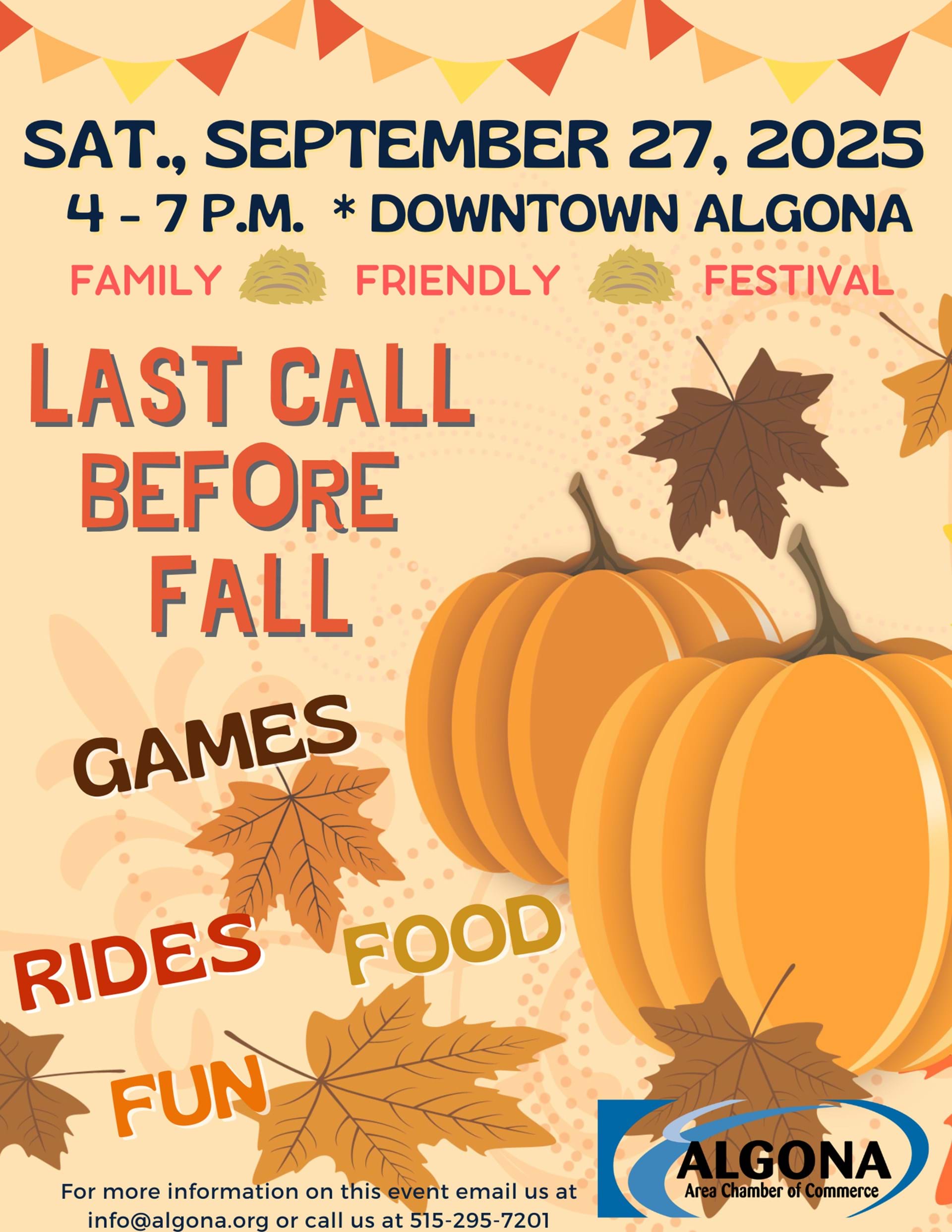 Last Call Before Fall event is full of Fall themed seasonal activities, food, and fun for every member of the family Last Call Before Fall festival on Saturday, September 27, taking place on State Street in downtown Algona from 4 – 7 p.m. It is an opportunity to interact and network with the community during a family-friendly, safe event. Participants plan and coordinate a game, activity, or food stand All local businesses and organizations are welcome to participate and utilize this opportunity to give back to your customers, network, promote and/or do some fundraising