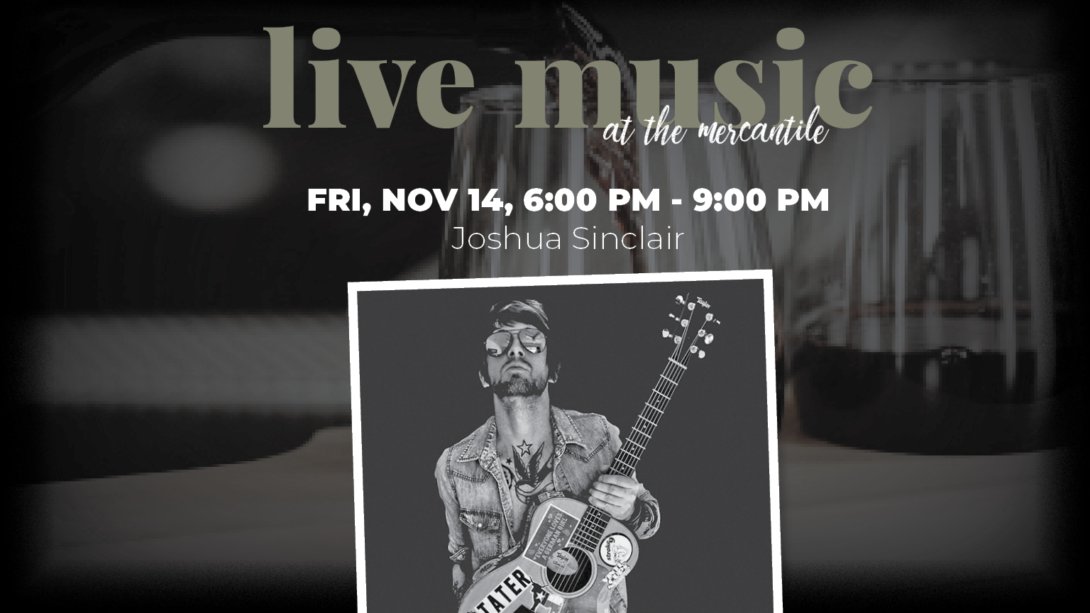 Kick off your weekend with live music at Middlebrook Mercantile Friday, November 14 from 6:00 p.m. – 9:00 p.m. Enjoy wine, snacks, and great company as Joshua Sinclair brings his signature sound to the stage. Come for the music, stay for the atmosphere!
