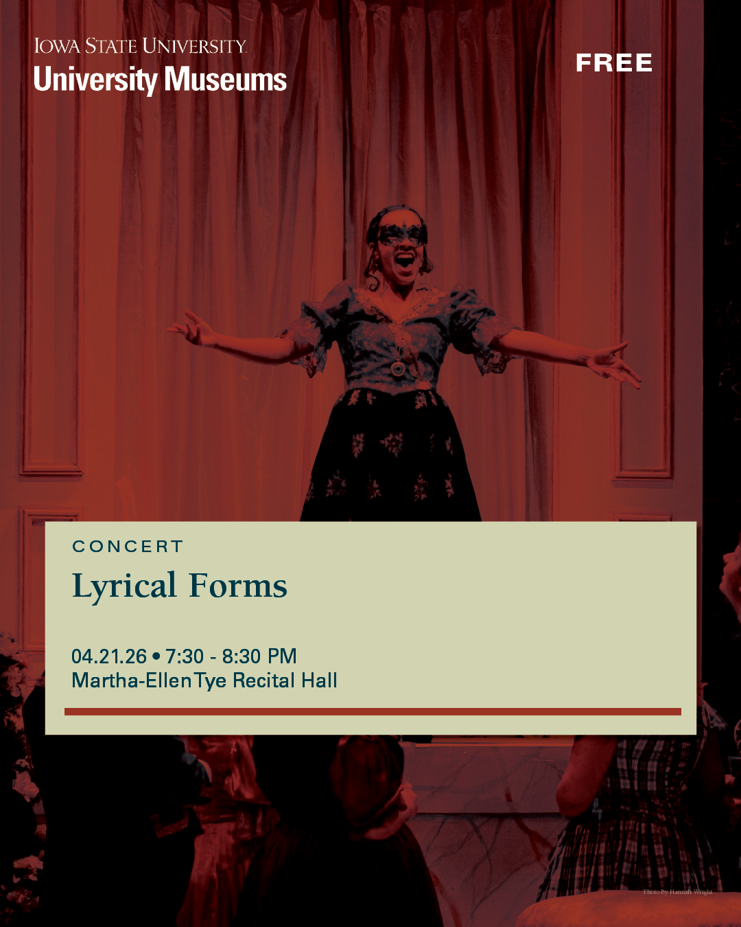 Treat your senses to a harmonious combination of visual and musical arts. Iowa State University Museums is proud to present a musical performance in partnership with the ISU Opera Studio within the Department of Music and Theatre. With a combination of song and art, see the Art on Campus Collection in a new light through a selection of student vocal performances that each pair with a different work in the Art on Campus Collection.