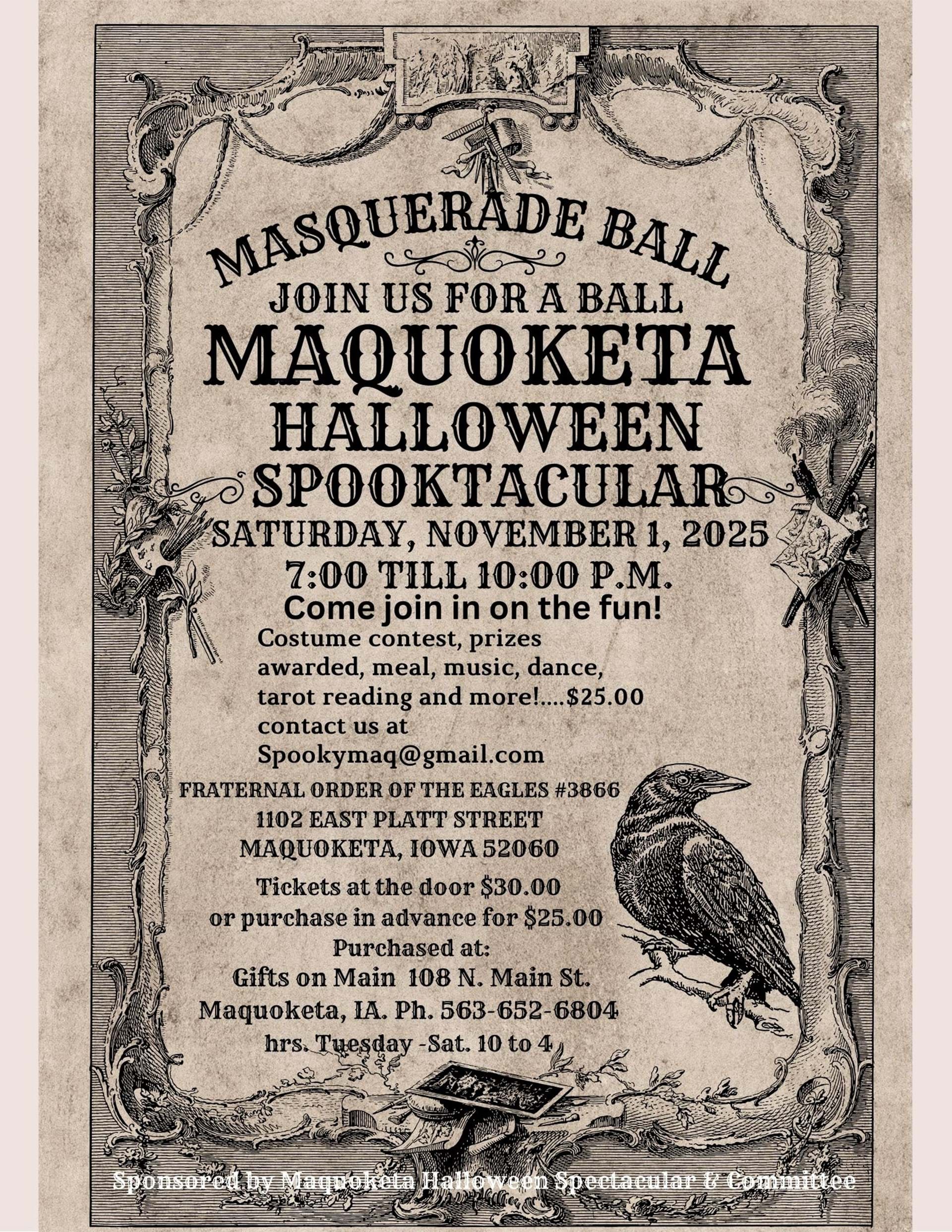 The festivities will take place on November 1st from 7:00 p.m. to 10:00 p.m. at the Fraternal Order of the Eagles Club #3866 located at 1102 E. Platt Street Maquoketa, Iowa 52060 The evening's entertainment will comprise of dinner and drinks, a costume contest with judging and prize distribution, and a special debut performance by musicians Yellavel Rapper and producer, and Sadbay Jmigo Rapper, who have collaborated on exclusive songs to be premiered live. Moreover, Larry Van Deusen from the Cedar Rapids, Iowa Eagles Club will provide Laryoke entertainment so let's impress him with our local talents, Dena Ochoa will offer Tarot readings for entertainment purposes, along with Christel Sanders will be offering Fairy witch readings. This event will also feature adult games and Ouija board and a costume contest with grand prizes to be awarded. Hearse rides will be offered on the premises from 4:00 until 6:00 p.m. Tickets are limited due to capacity so order your tickets early by contacting Maquoketa Halloween Spooktacular by e-mailing Spookymaq@gmail.com or call 319-651-2861 Tickets are $25.00 per person and your ticket number will put your name into a drawing for prize drawings.