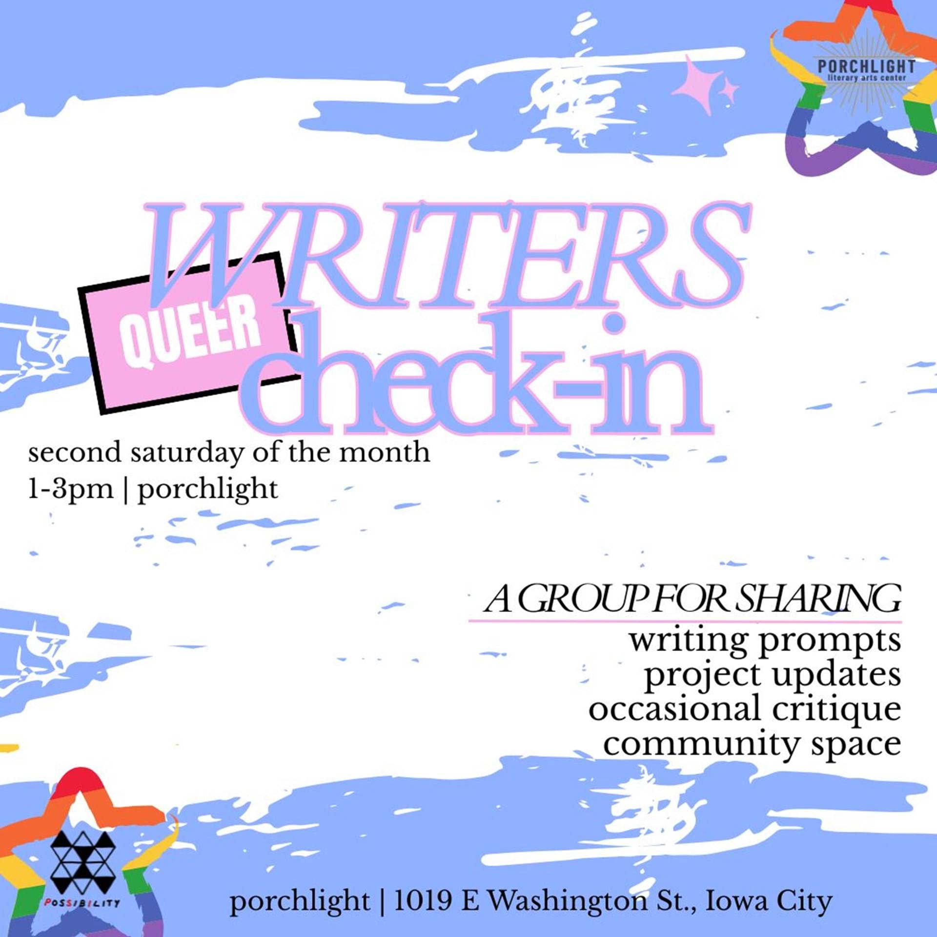 Queer Writers' Check In Similar to our Long Project Check In, this group is for queer writers looking to build literary community together. Each session will include free writing, discussion of works in progress, and general literary support. Occasionally, there will be guests and opportunities for trading work. The group will meet at PorchLight Literary Arts Center (1019 E Washington St, Iowa City) and is co-hosted by Public Space One.