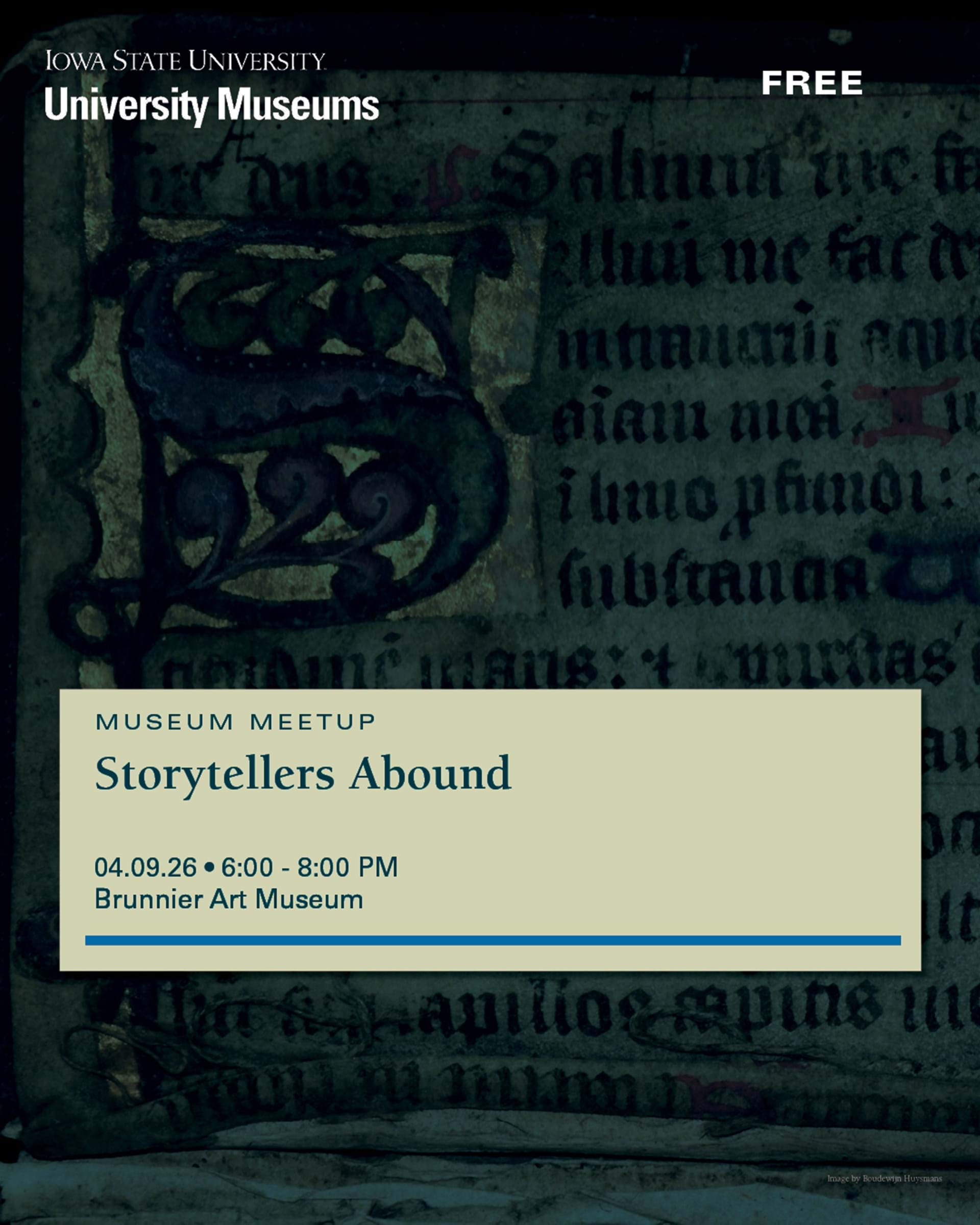 Fairytales can be some of the first stories we’re told, sparking imagination and curiosity. Visit the to the Brunnier Art Museum to explore the visual storytelling exhibitions Tell Me A Story and Mapping Infrastructure/Mapping Agriculture. Create your own name or letter sign inspired by illuminated manuscripts and grab a take-home snack. Guests are encouraged to come dressed as their favorite fantasy character. Museum Meetups are free and open to all ISU students and their guests. No registration required. Drop in anytime between 6-8 p.m.
