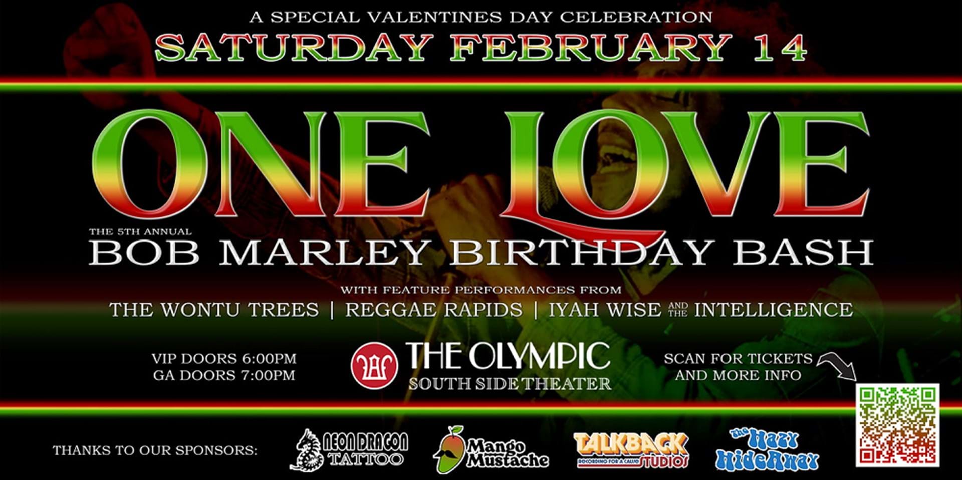 The Bob Marley Birthday Bash returns for the 5th annual celebration at The Olympic in Cedar Rapids. Join us for a special Valentine's Day celebration honoring the life, music, and messages of Bob Marley. Look forward to feature performances from The Wontu Trees (Quad Cities), Reggae Rapids (Cedar Rapids), & Iyah Wise and the Intelligence (California) - all paying homage to the legendary catalog of Bob Marley and The Wailers. - Family Friendly, All Ages - ~Early Bird Tickets Available Now~ *Limited Valentines Couples & V.I.P. Ticket Options Available* *V.I.P. Experience includes entry to the venue at 6:00 p.m., an acoustic performance at 6:30 p.m., specialty desserts prepared by a guest chef, and gifts from event sponsors* Thanks to our event sponsors: Neon Dragon Tattoo Mango Mustache TalkBack Recording Studios The Hazy HideAway
