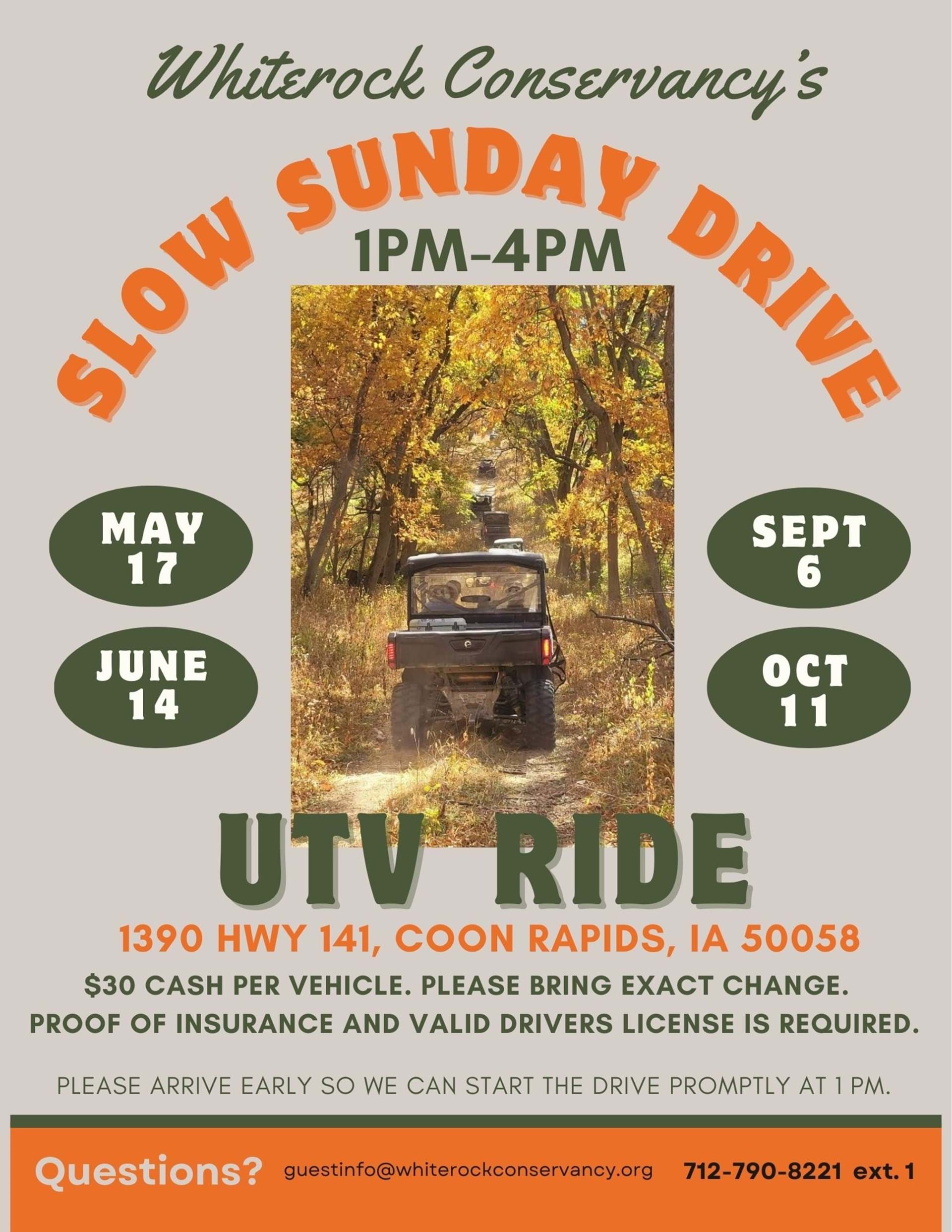 Whiterock Conservancy Slow Sunday Drive UTV Ride 1390 HWY 141, Coon Rapids, IA 50058 $30 cash per vehicle, please try to bring exact change. Proof of insurance and a valid driver's license are required. 1 -4 p.m. Please arrive early so we can start the drive promptly at 1 p.m.
