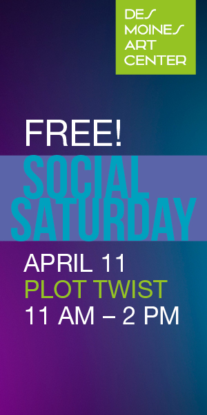 Join the Des Moines Art Center’s April Social Saturday event: Plot Twist! Enjoy crafts in the Art School studios, a free guided tour, a unique performance in Levitt Auditorium, treats in the Art Center Café, and so much more! Schedule of Events: 11:15 – 11:30 .m. | Storytime Levitt Auditorium 1 – 2 p.m. | Themed Guided Tour (all ages) Meet in the Macomber Lobby 1:30 p.m. | Christine Rebet and Simone Harris: Live Performance, Film Screening, and Artist Conversation around “The Fall” Levitt Auditorium Registrations recommended. Drop-in Activities (11 a.m. – 2 p.m.): Museum Galleries Find the Social Saturday interactive Art Cart in the galleries. Relax for a while and enjoy a book nook reading setting among the art, set up throughout the museum galleries. Scavenger Hunt throughout the museum. Macomber Lobby Browse a variety of books available through the Museum Shop, plus grab a free Social Saturday bookmark! Art Center members get 10% off everyday in the Museum Shop! Art School Studios Explore creativity and your inner artist! Free drawing available in Studio 5, as well as zine/mini-comic book making and flip stick animations in the other studio spaces. Art Center Café Stop by for a sit-down lunch or a delicious la mie pastry; a full hot/cold espresso menu is available. Art Center members receive a 10% in the café every day.
