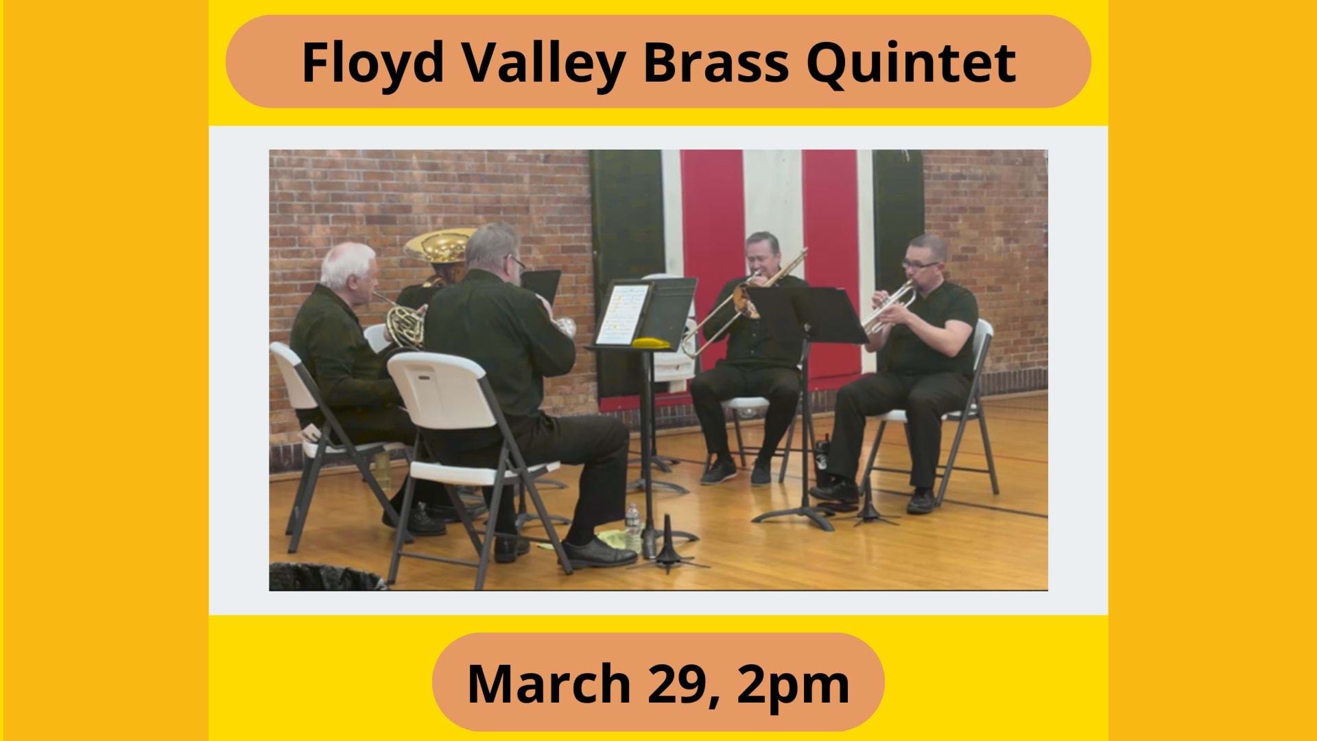 On Sunday, March 29, 2026, at 2:00 p.m. the Betty Strong Encounter Center welcomes back the Floyd Valley Brass Quintet who will present “Splendor in the Brass.” The group is excited to play here again and their show will include a variety of entertaining music. Admission is free, but freewill donations encouraged. The Floyd Valley Brass quintet was formed early in 2025 under the direction of Joe Brice. Mr. Brice was director of bands at Le Mars Community Schools high school from 1959-1974. He then was band director at Cherry Creek School District in S.E. suburban Denver before returning to Le Mars in 2024.