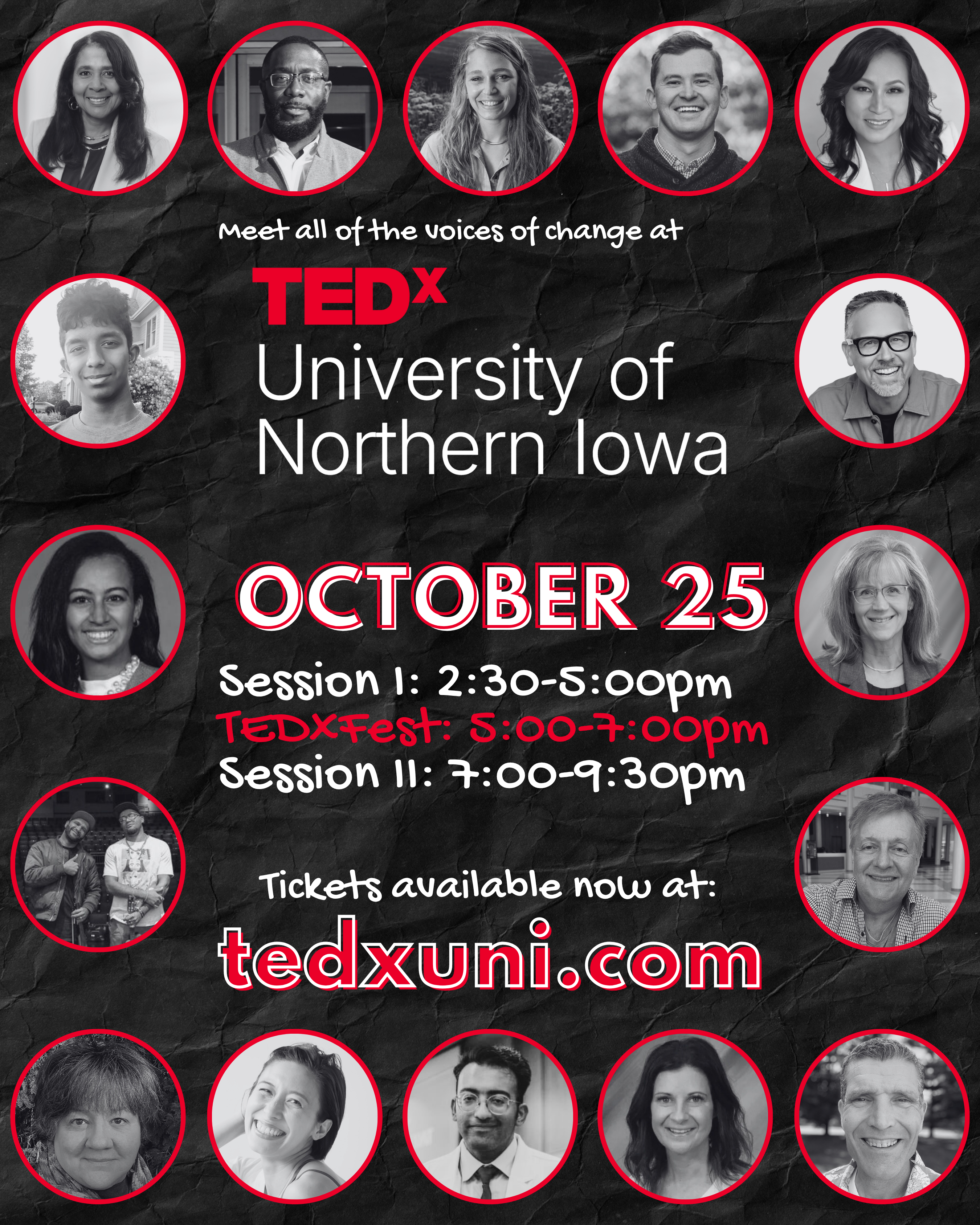TEDxUniversity of Northern Iowa: Ideas Worth Spreading, Right Here at UNI On Saturday, October 25, 2025, UNI will host its first-ever TEDxUniversity of Northern Iowa, bringing the spirit of “ideas worth spreading” to campus. The event will feature UNI faculty, alumni, and community voices sharing bold, thought-provoking talks under the theme Creating Tomorrow—a call to imagine, innovate, and act. Speakers include Dr. Elaine Eshbaugh on facing dementia with honesty and compassion, Gary Gute on how creativity shapes everyday life, Mayor Quentin Hart on unity and leadership, Tatiana Rice on ethics in artificial intelligence, The B2Wins on transforming adversity through music, and Sarah Helleso on empathy and belonging in education. The creative team Morning Run will also present their award-winning short film Sharp and share insights from their filmmaking journey. Through two engaging sessions and the lively TEDx Fest, attendees will experience storytelling, music, and ideas that inspire connection and action. TEDxUNI is more than an event—it’s a movement that amplifies UNI’s culture of creativity, compassion, and community. Supported by campus and local partners, this inaugural TEDx celebrates the power of ideas to shape the future of UNI, the Cedar Valley, and beyond. Join us October 25 and be part of the conversation.