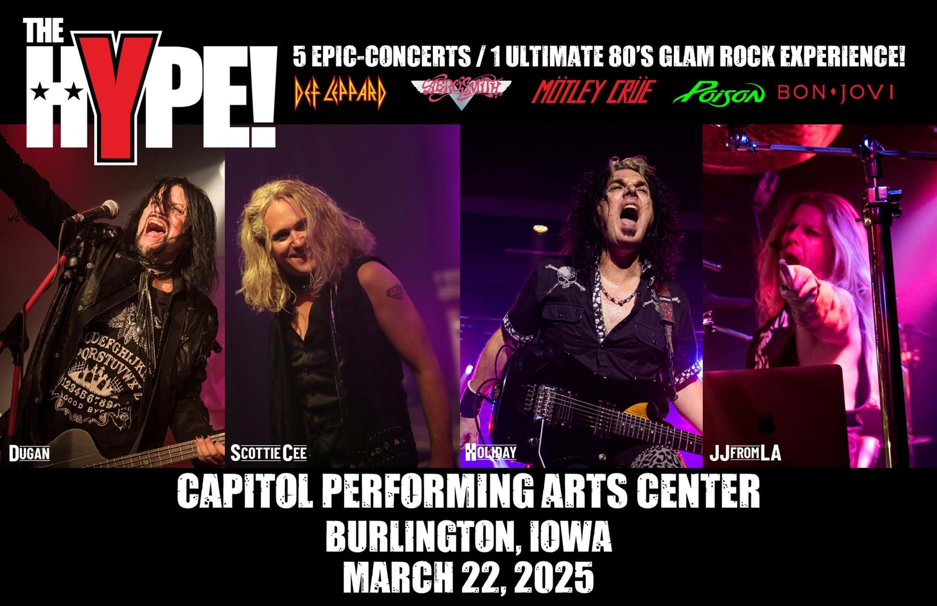 You can believe The HYPE! Five epic concerts in one ultimate ‘80s glam rock experience: Bon Jovi, Motley Crue, Def Leppard, Poison and Aerosmith, with huge stage production & rock star presence to create an authentic rock & roll revel! This is a tribute performance '80s kids won't want to miss. Tickets are $30 (premium seating $40) online and at the Capitol box office. burlingtoncapitoltheater.com