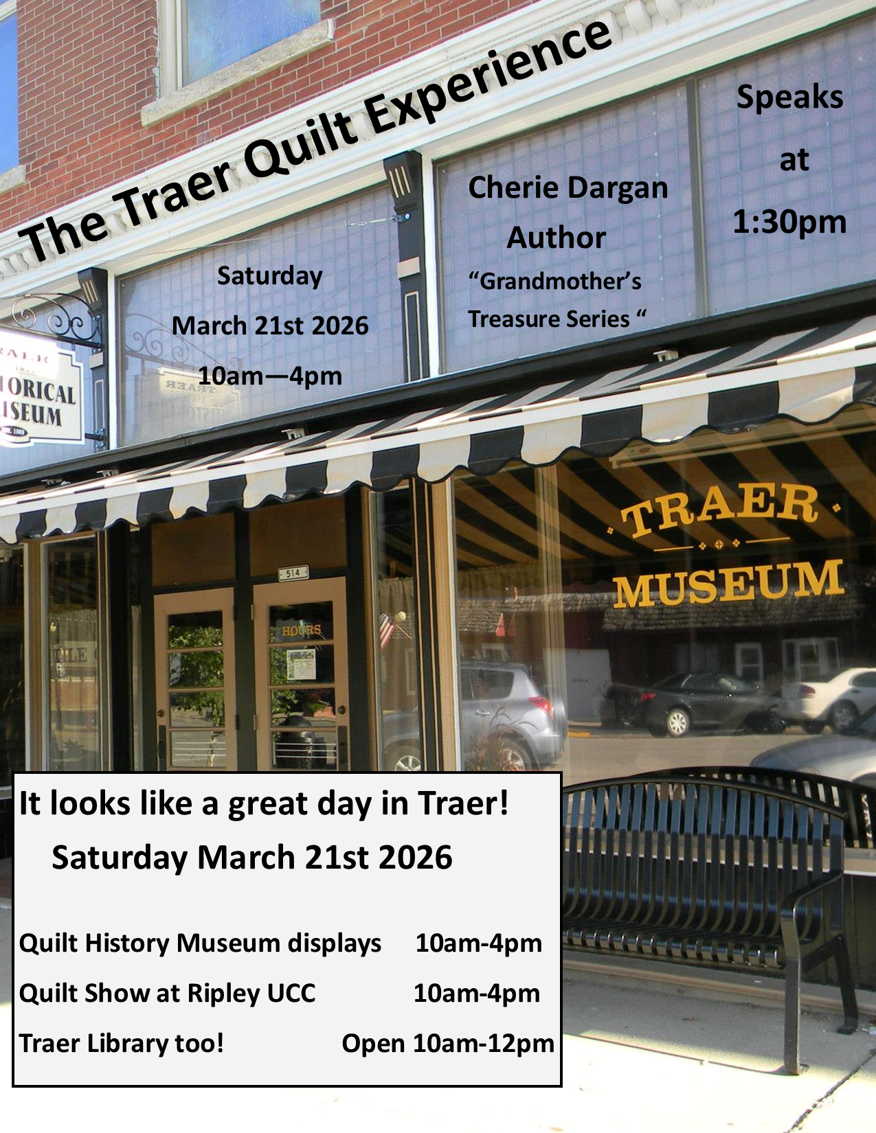 The Traer Quilt Experience brings together not only quilt enthusiasts, but young artists in the community and members of the surrounding areas as Ripley UCC, The Traer Historical Museum and the Traer Public Library collaborate on this event. All three venues open at 10 a.m.. Quilt displays, art projects, historical and family exhibits abound. While in Traer, check out Simply Blooming for speciality drinks, Retro Rooster for antiques and collectibles. Climb the Bean Stalk, or "Wind UP" the famous Traer Winding Stairs for one of a kind photo ops. Grab lunch at Ripley from 11 a.m. - 2 p.m. or dinner at LaTerraza Mexican Restaurant. Grab your friends and make a day of it in Traer, located conveniently at the intersection of US 63 and IA 8.