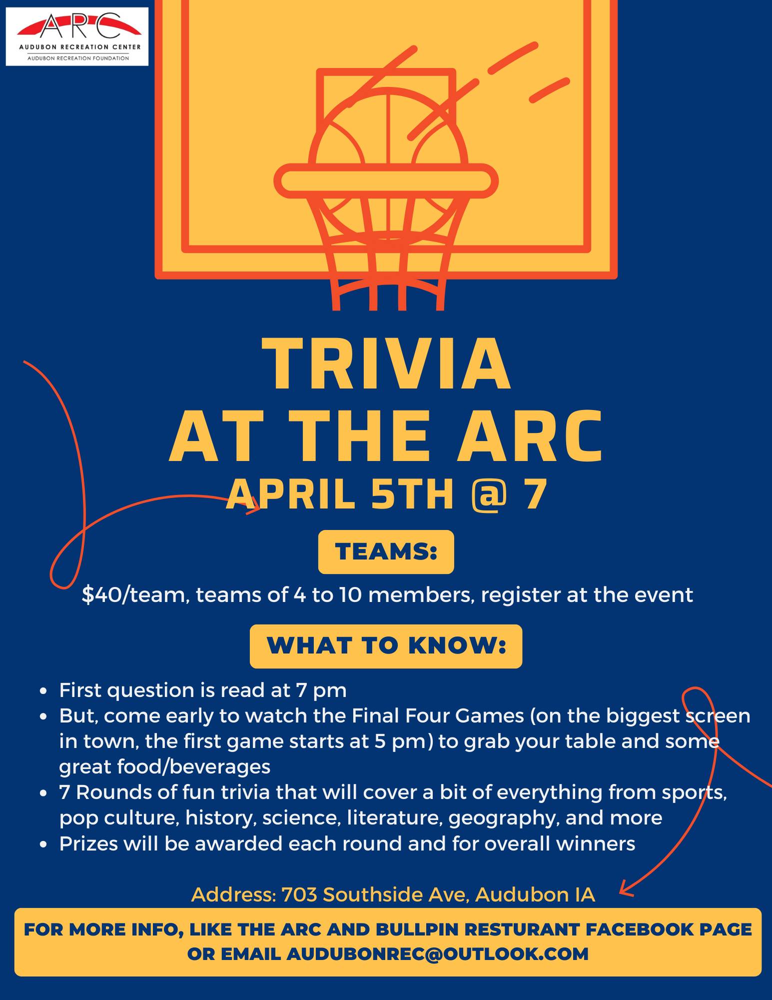 Mark your calendars, Trivia at the ARC is back and better than ever for the Final Four on April 5th! Info on Flyer.