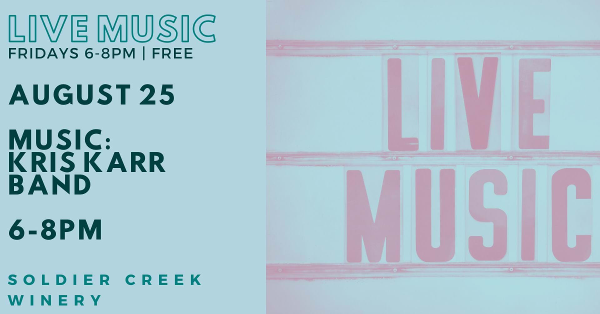 Join us for FREE, LIVE music every Friday from 6-8 p.m. Band: Kris Karr Band Join us for an electrifying evening of live music at Soldier Creek Winery on Friday, August 25th from 6-8 p.m. Vineyard Vibrations proudly presents the Kris Karr Band, a dynamic five-person ensemble that is sure to rock your world. Known for their powerful harmonies and captivating stage presence, the Kris Karr Band delivers a big, energetic sound that will have you dancing and singing along. Experience the thrill of classic rock hits like never before as this talented group takes the stage. Don’t miss your chance to be part of an unforgettable night of music and fun. Grab your friends, raise a glass of our finest wines, and let the Kris Karr Band transport you to a musical paradise. Snacks are available for purchase, but you are more than welcome to bring your own food. Beverages from home will not be allowed per our Iowa Liquor License.