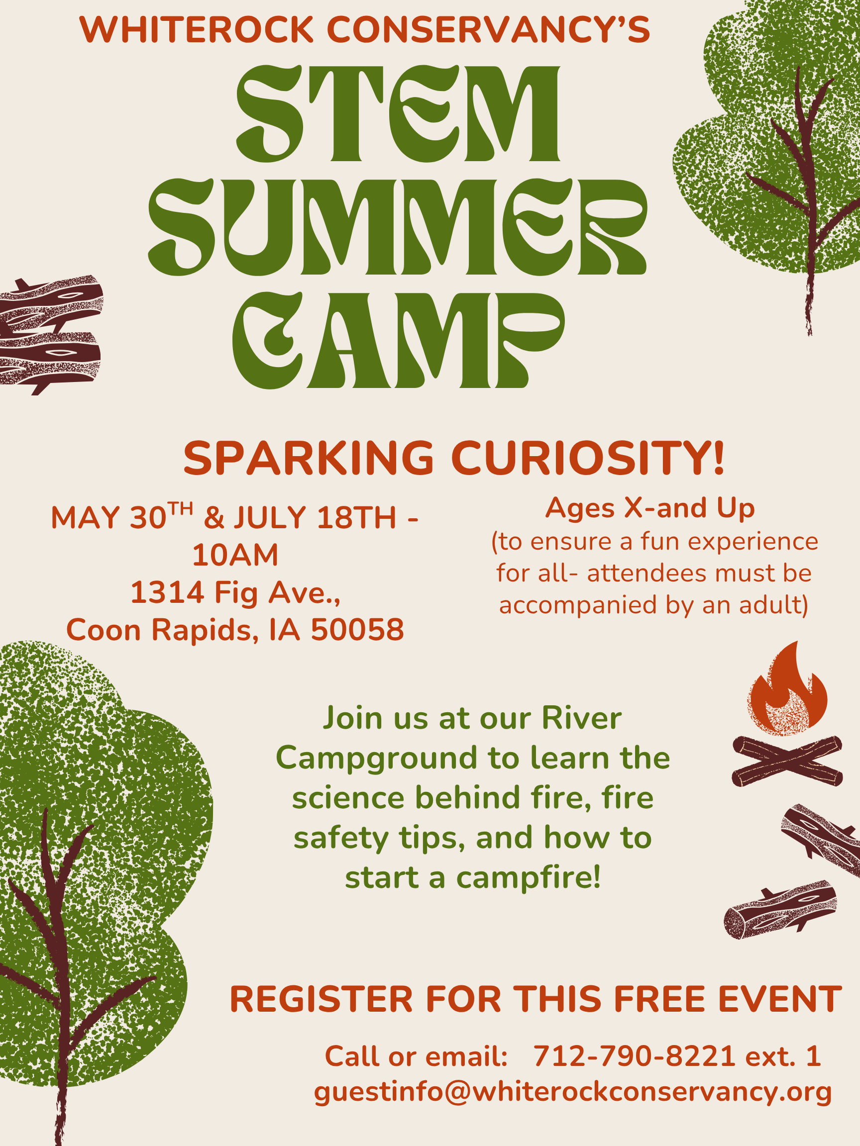 Whiterock Conservancy Stem Summer Camp Sparking Curiosity! Saturday May 30th & Saturday July 18th 10 a.m. River Campground 1314 Fig Ave, Coon Rapids IA 50058 Ages: X-and Up To ensure a fun experience for all attendees must be accompanied by an adult. Join us at our River Campground to learn the science behind fire, fire safety tips, and how to start a campfire. Register for this FREE event Call or email: 712-790-8221 Ext. 1 or guestinfo@whiterockconservancy.org