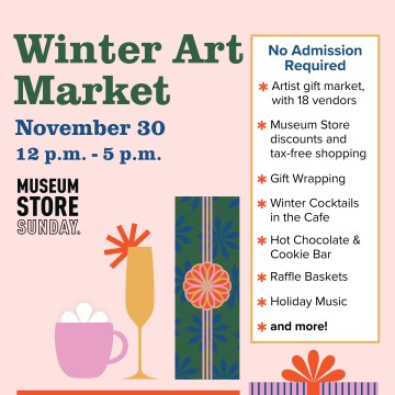 Get in the Holiday Spirit at the Figge! Celebrate the season at the Winter Art Market on Museum Store Sunday. Discover one-of-a-kind, handcrafted gifts from talented local artists, pick up stocking stuffers with flair, and enjoy special savings in the Museum Store. Sip and savor the season with live music, a decadent hot chocolate bar with all the fixings, and festive winter cocktails. It’s the perfect way to shop, mingle, and kick off the holidays in style — a day you won’t want to miss! Participating Gift Market Artists: Berèskin Gallery (Pat Bereskin) – Local artist, educator, and arts advocate skilled in multiple mediums. Shop festive holiday cards and hand-crafted glass ornaments. Estevan Cornejo – Multimedia artist working in printmaking, drawing, sculpture, and painting. Shop original prints and artful stickers. Pamela Crouch – Mixed-media artist creating with found and repurposed materials. Shop evergreen-themed artwork in a variety of forms. Gina’s Art (Gina Kirschbaum) – Acrylic and mixed-media artist inspired by color and texture. Shop original paintings, poster prints, and greeting cards. B. Hueting Creates (Barbara Hueting) – Jewelry artist working in sterling silver, copper, recycled metals, and gemstones. Shop one-of-a-kind handmade jewelry. Peptic Robot Press (Joseph Lappie) – Professor and printmaker known for nationally and internationally shown work. Shop relief prints, artist’s books, and letterpress poetry broadsides. The Light Within – Dyes & Designs