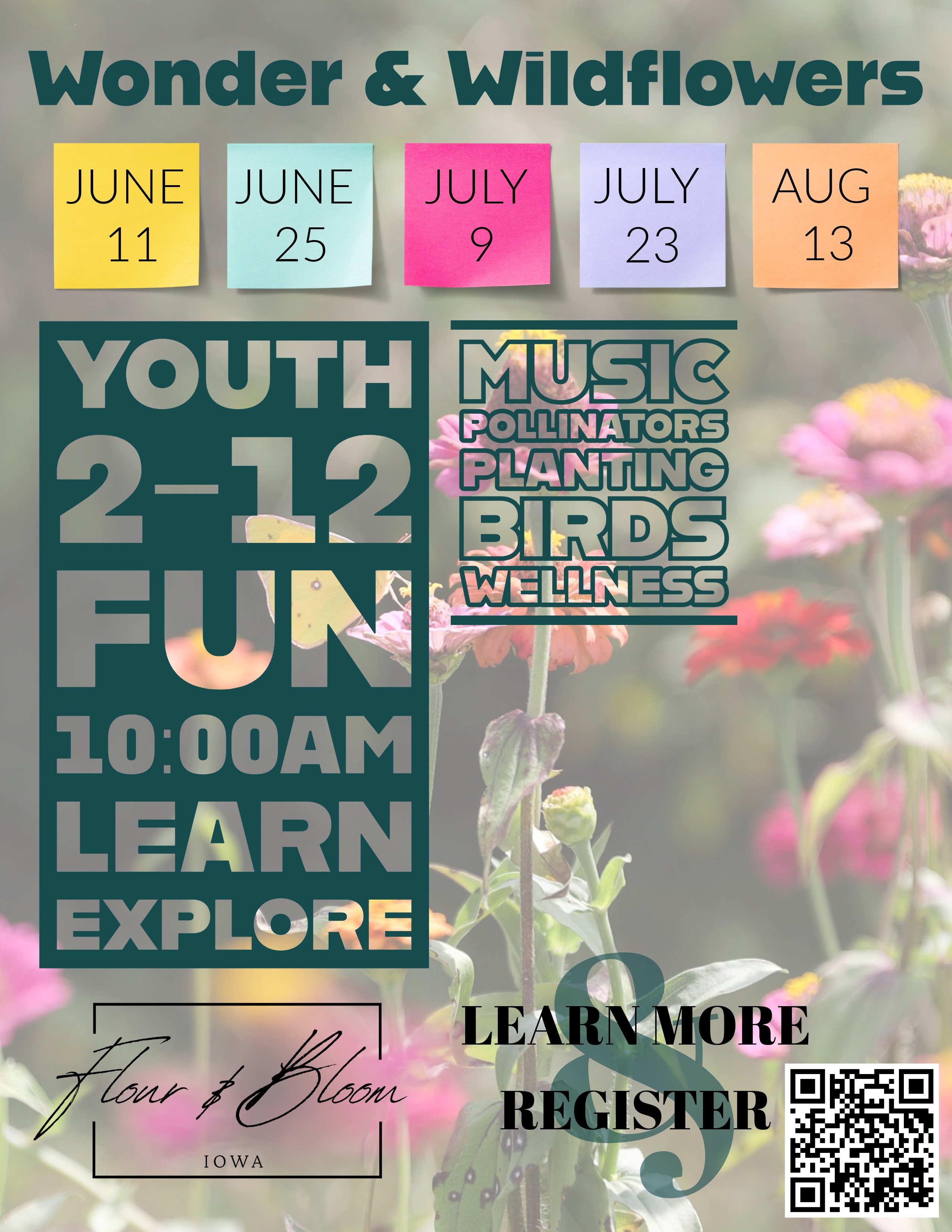 Where Young Minds Bloom Wonder & Wildflower Kids is a nature-inspired children’s program at Flour & Bloom, created to spark curiosity, creativity, and a love for the outdoors. Throughout the summer, kids will explore the farm through hands-on activities, arts & crafts, simple learning experiences, and a snack at every gathering. We’ll even be planting a special garden just for kids, and welcoming special guest educators for playful, educational fun. Topics are still being finalized, but every date will offer meaningful, age-appropriate experiences rooted in nature and creativity. Dates: Held the Second & Fourth Thursdays throughout the Summer June 11 • June 25 • July 9 • July 23 • August 13 (5 total dates) Details: • Ages 2–12 welcome • Children ages 2–5 must attend with a caregiver who stays and participates • $10 per date • Register for all 5 dates and receive $10 off (one date free!) Join us for fun on the farm—learning, growing, and blooming together. Sign up to save your spot!