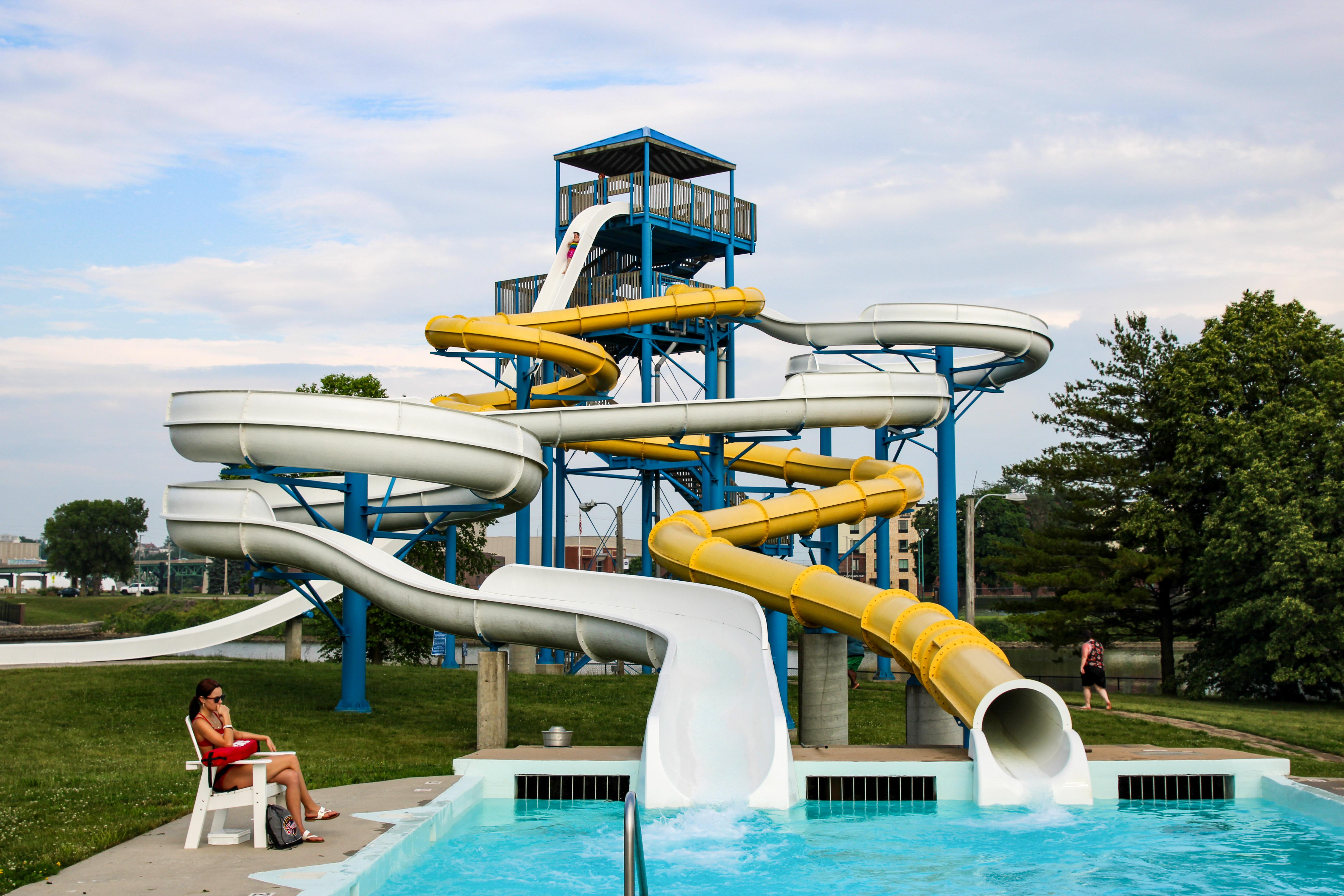 Wave pool, speed slide, 340-foot body slide, 250-foot enclosed flume waterslide, kiddie play area, sand volleyball, basketball, indoor tube slide and indoor competitive pool. The indoor beach is open all year - Monday through Friday 5 a.m. to 7 p.m., Saturday and Sunday 1 to 4 p.m. The outdoor beach is open seasonally - Memorial Day weekend through the last Sunday in August from 12 to 8 p.m.