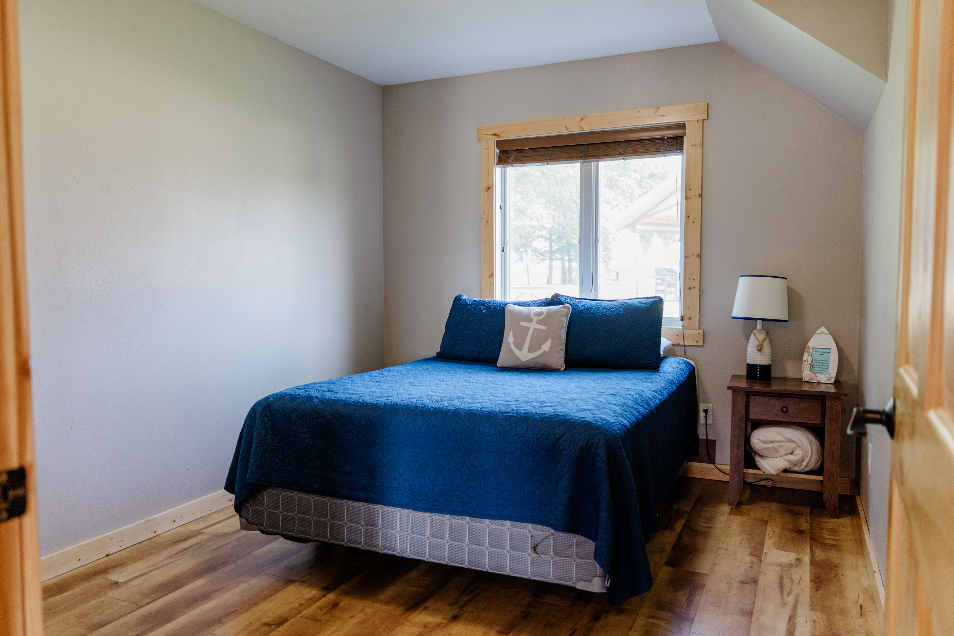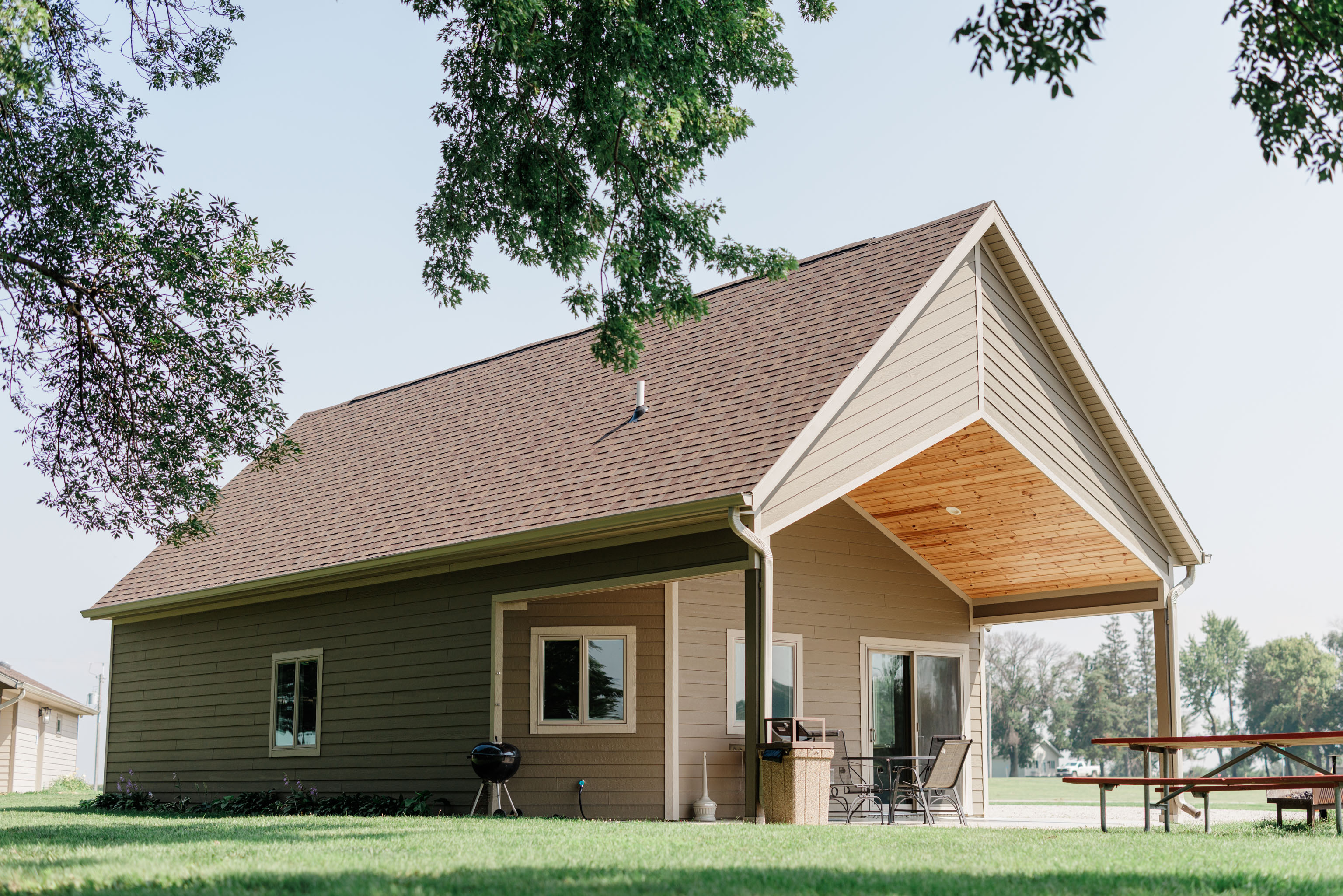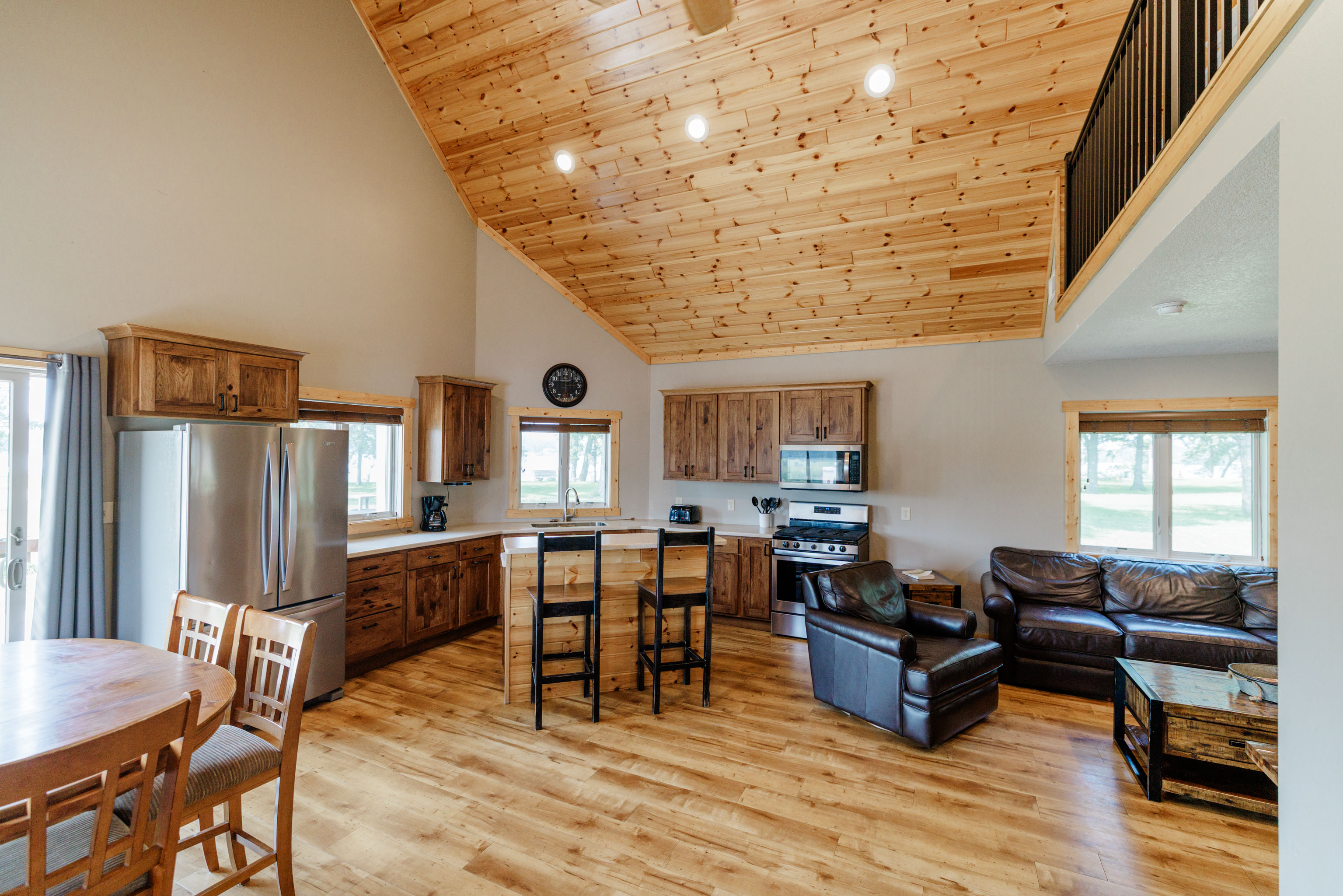 Cabin #1 is a city-owned cabin in Emmetsburg's Five Island Campground nestled on the east shore of Five Island Lake. The cabin sleep up to nine guests and offers a private bedroom, loft with three beds, full kitchen, full bathroom with washer and dryer, comfortable living room, wi-fi, and patio with fire pit and gas grill. The cabin is just steps away from a playground, covered shelter that can be rented for gatherings, and a public dock.