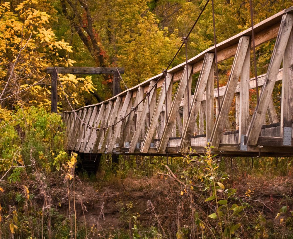 Guye Woods County Park is one of Madison County’s most rugged and secluded natural areas, located about six miles northeast of Winterset along the North River. This 93-acre wilderness park offers a true back-to-nature experience where visitors can explore dense timber, steep hillsides, and scenic river landscapes. A highlight of the park is a 100-foot cable suspension bridge that spans the North River and serves as the only access point into the wooded interior, creating a memorable start to any visit. Beyond the bridge, river bottom timber rises into upland hardwood forest, including the highest elevation point in Madison County. Guye Woods is managed as a wilderness area, with no groomed trails, encouraging visitors to explore using natural game paths. The undeveloped setting makes it ideal for hiking, birdwatching, spring wildflower viewing, and quiet nature study. Anglers can fish the North River for channel catfish, while public hunting is permitted in season. Located a short drive from Winterset’s historic attractions and covered bridges, Guye Woods offers adventurous visitors a chance to experience Madison County’s wilder side and discover a landscape shaped by nature.