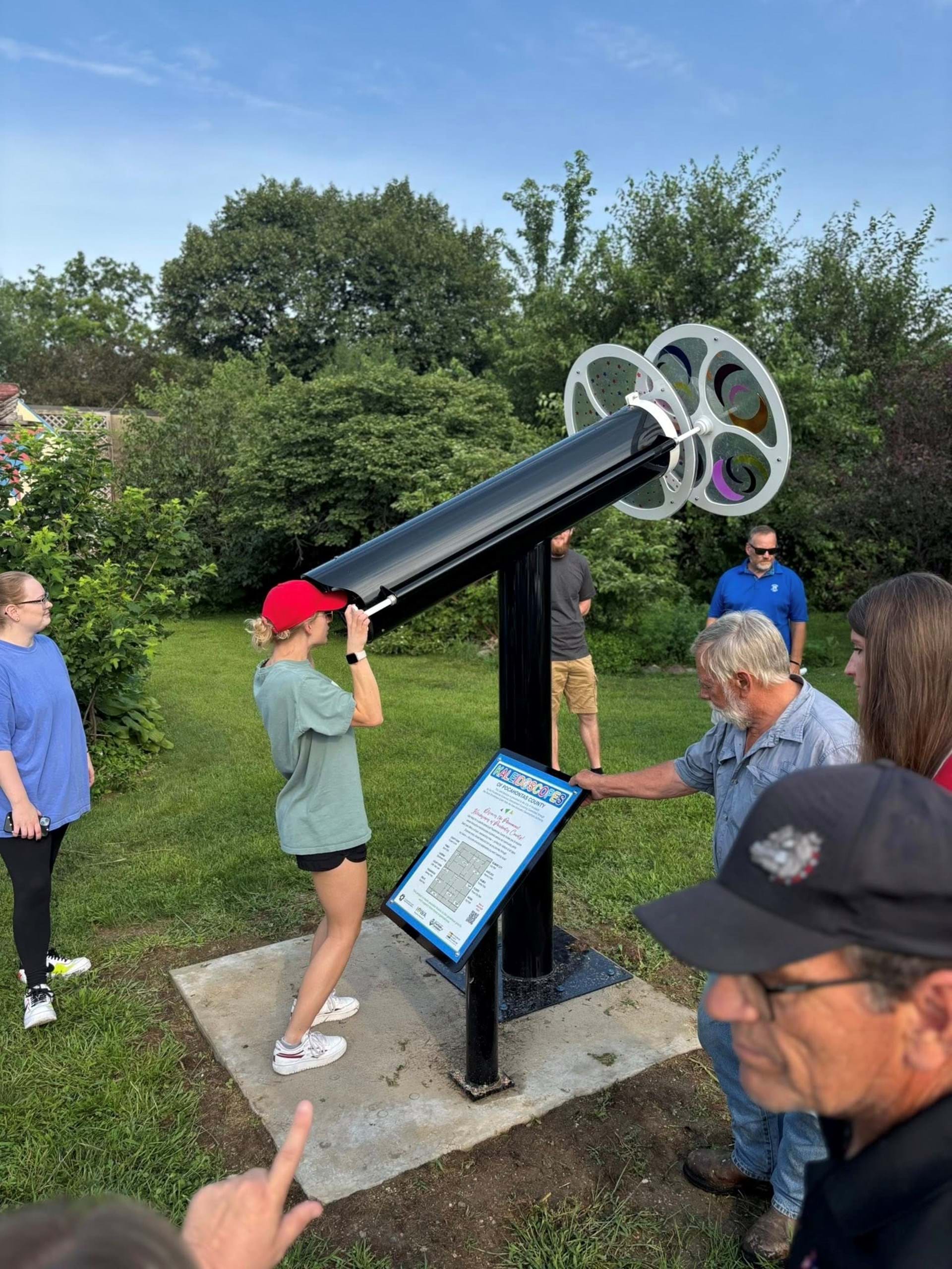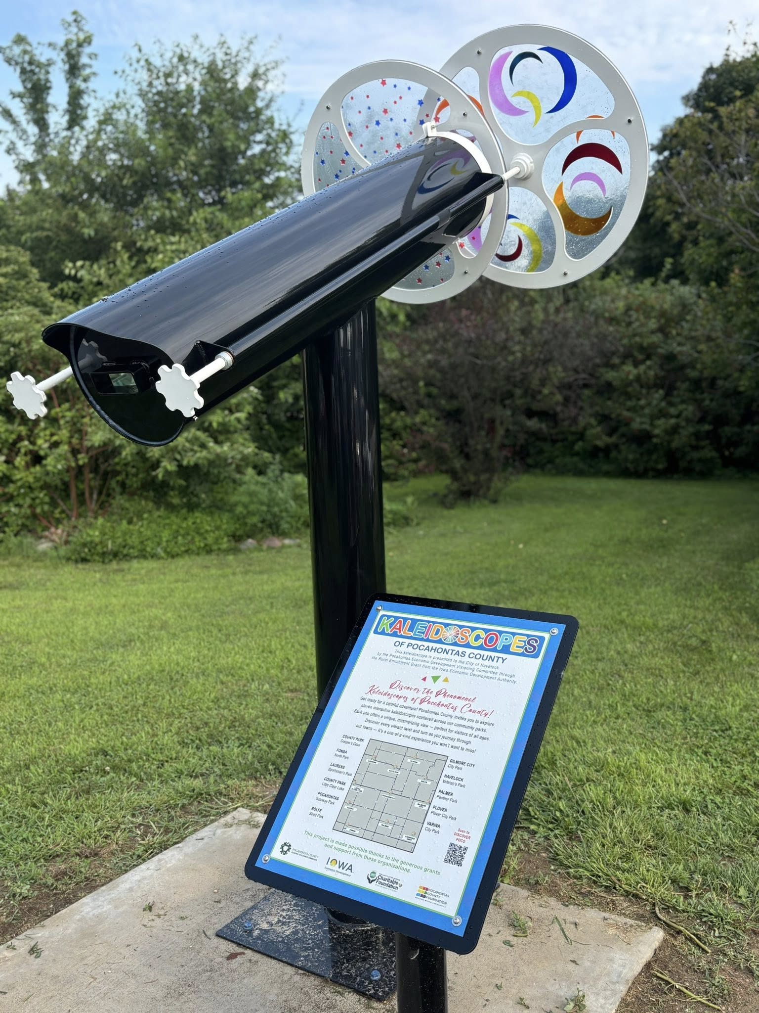 Discover the fascinating kaleidoscopes across Pocahontas County, Iowa! Known as a major tourist attraction for Pocahontas, these 11 kaleidoscopes provide a fun day trip for your family and friends. Each one as different colors to represent the history of the community and a unique design inside. The Havelock Scope is located at Veteran's Park in downtown Havelock.