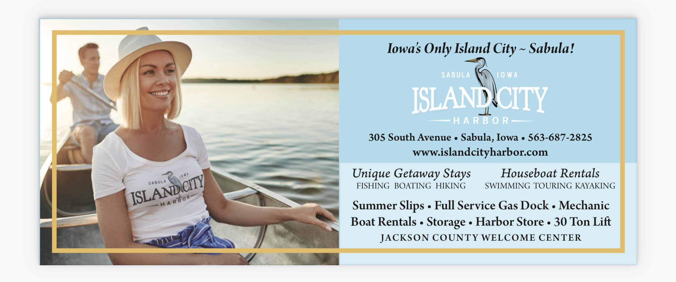 Home of the Jackson County Welcome Center. Island City Harbor is nestled in the bluffs of the Mighty Mississippi River. Coddiwomple to Sabula, Iowa and enjoy the beautiful drift less area. We are a 140 slip marina located on the upper Mississippi River on Iowa's only island city. We can accommodate boats up to 80 ft, with channel depths averaging 6 ft. We have a harbor store filled with a variety of nautical home decor, handmade jewelry, recycled hand bags, bait and tackle. We provide bathhouse and laundry facilities for our boaters. We have a gas dock and full time Marine technician and a friendly staff. We love new visitors so come and coddiwomple to our Island City. We invite you to have fun! Iowa Proud! We have pontoon, kayaks, pedal boats, paddle boards and canoe rentals available. Unique overnight stays in a houseboat or a floating Cottage Iowa’s only Island City!!!!