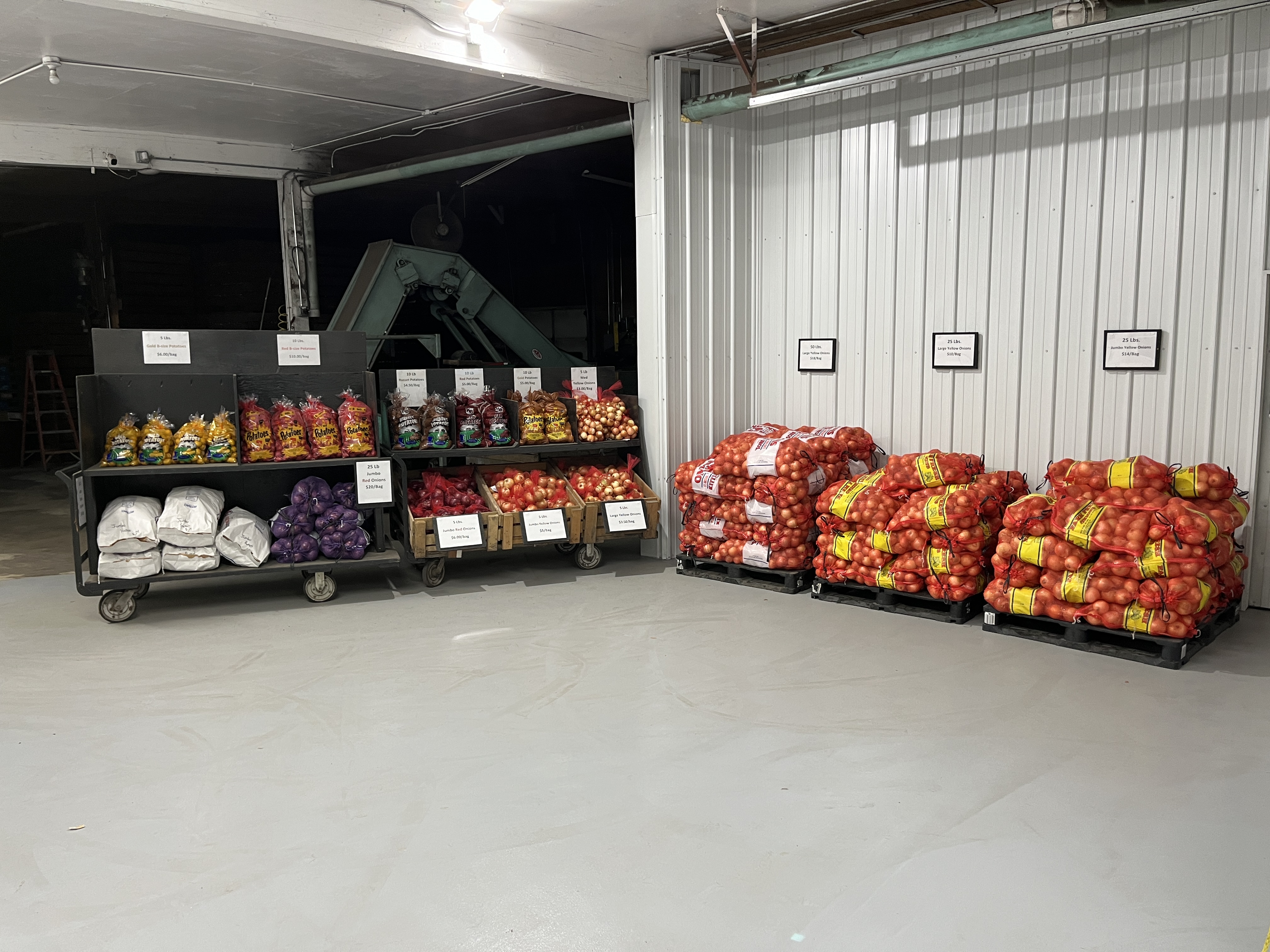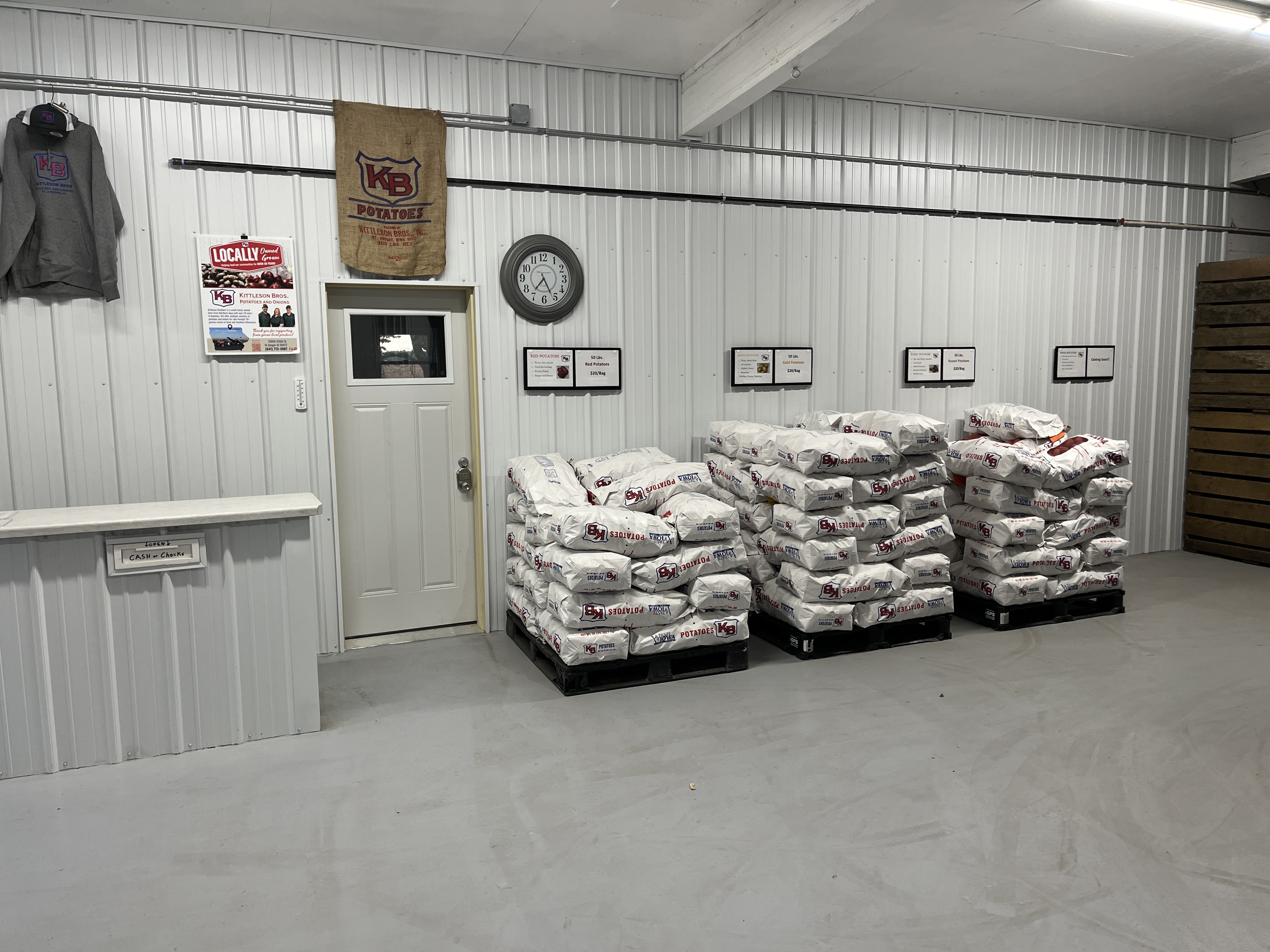 Kittleson Brothers Potatoes and Onions has been growing and selling potatoes and onions to local families and grocery stores for generations. Located 1 mile south of St. Ansgar-The Garden Spot of Iowa, produce can be purchased on-farm seasonally from October through May at the warehouse store. They also pack and deliver to over 30 grocery stores across the Cedar Valley. At Kittleson Brothers, you can find a variety of red and yellow onions, as well as red, gold, russet and white potatoes. The farm grows all produce sold a few miles to the west of their warehouse in a peat bed. The rich soil gives the potatoes a distinct Iowa flavor that customers rave about. The farm is currently owned and operated by Steve & Beth Rachut and Adam & Rosie Koch.