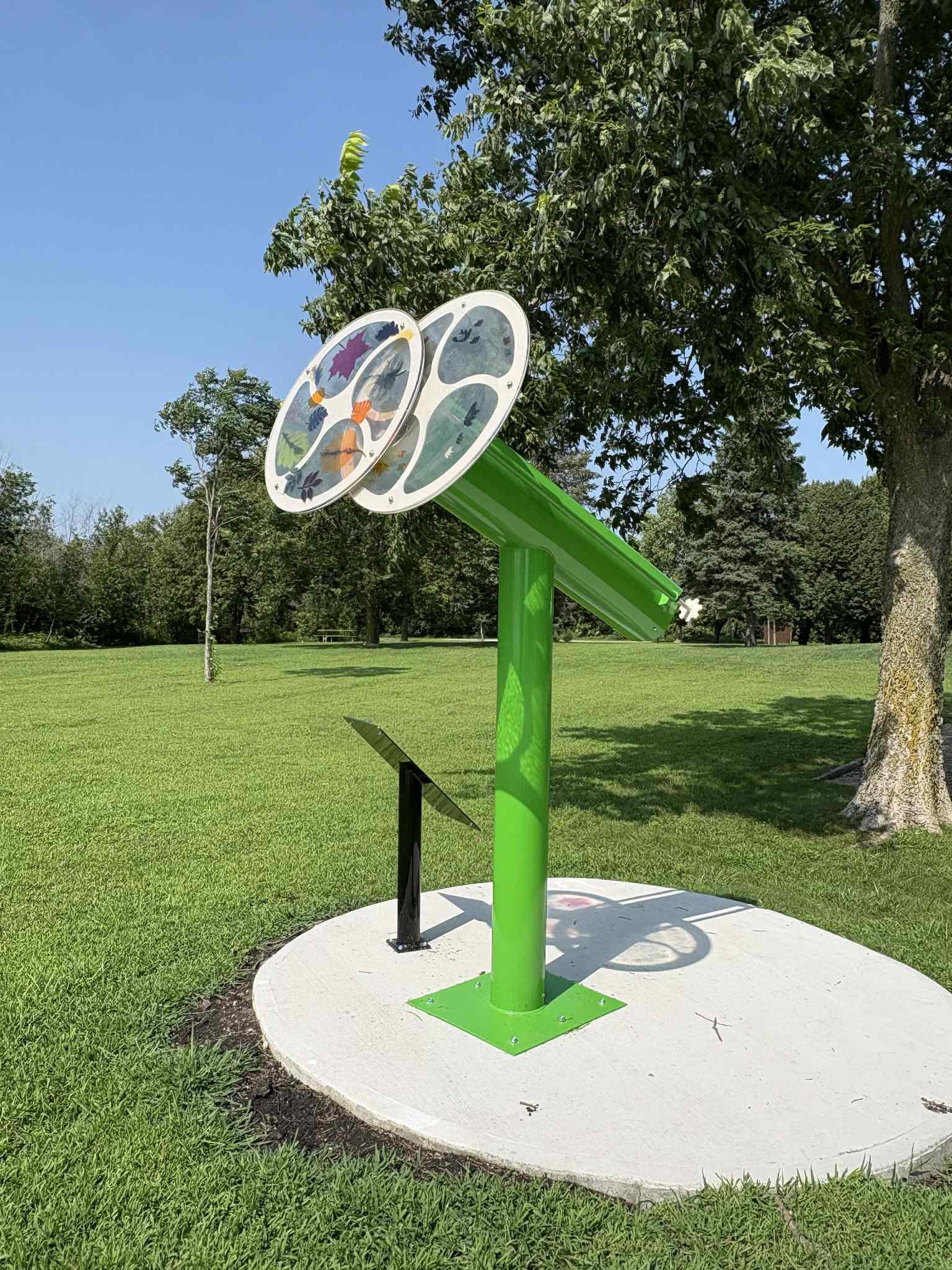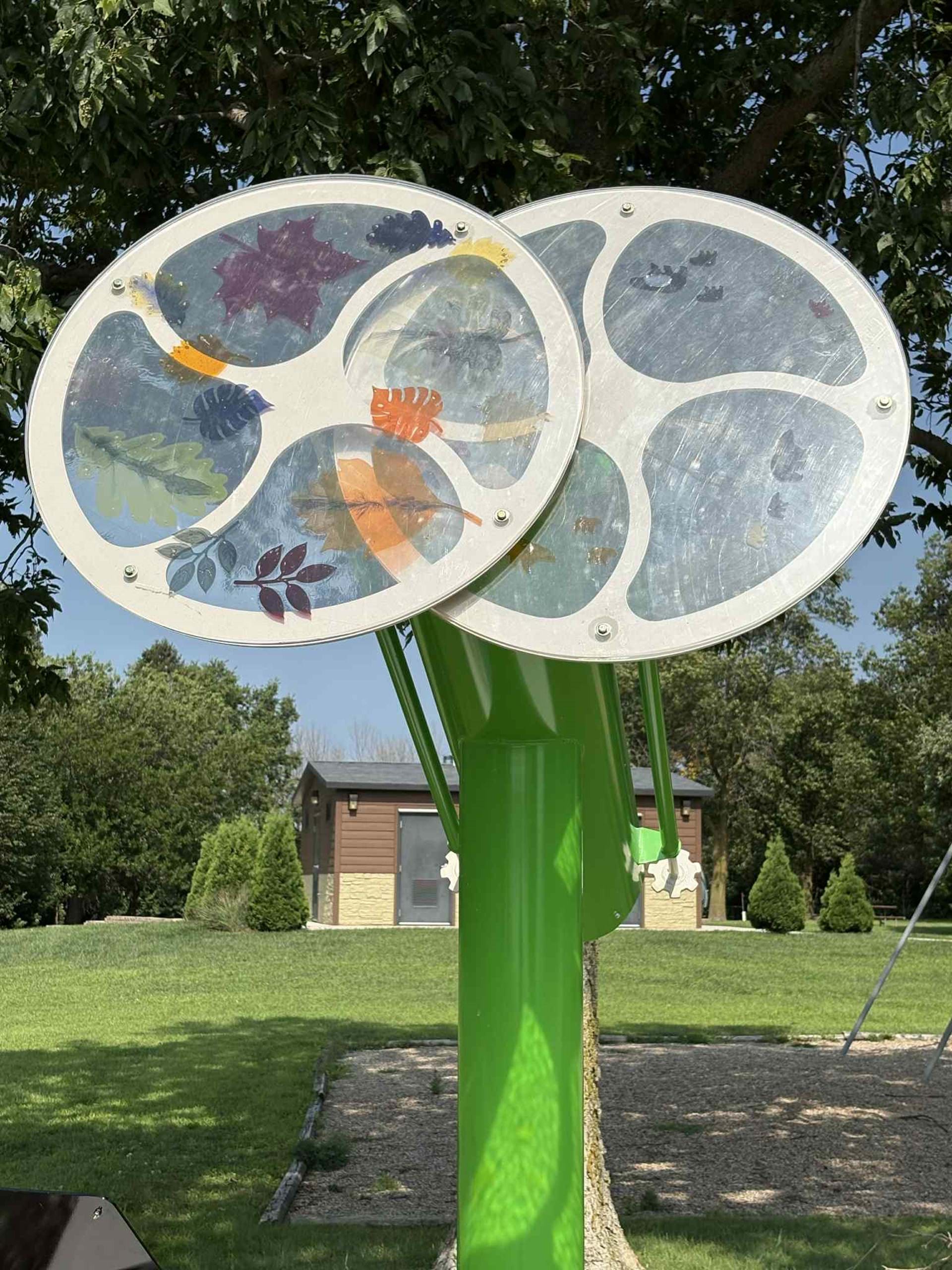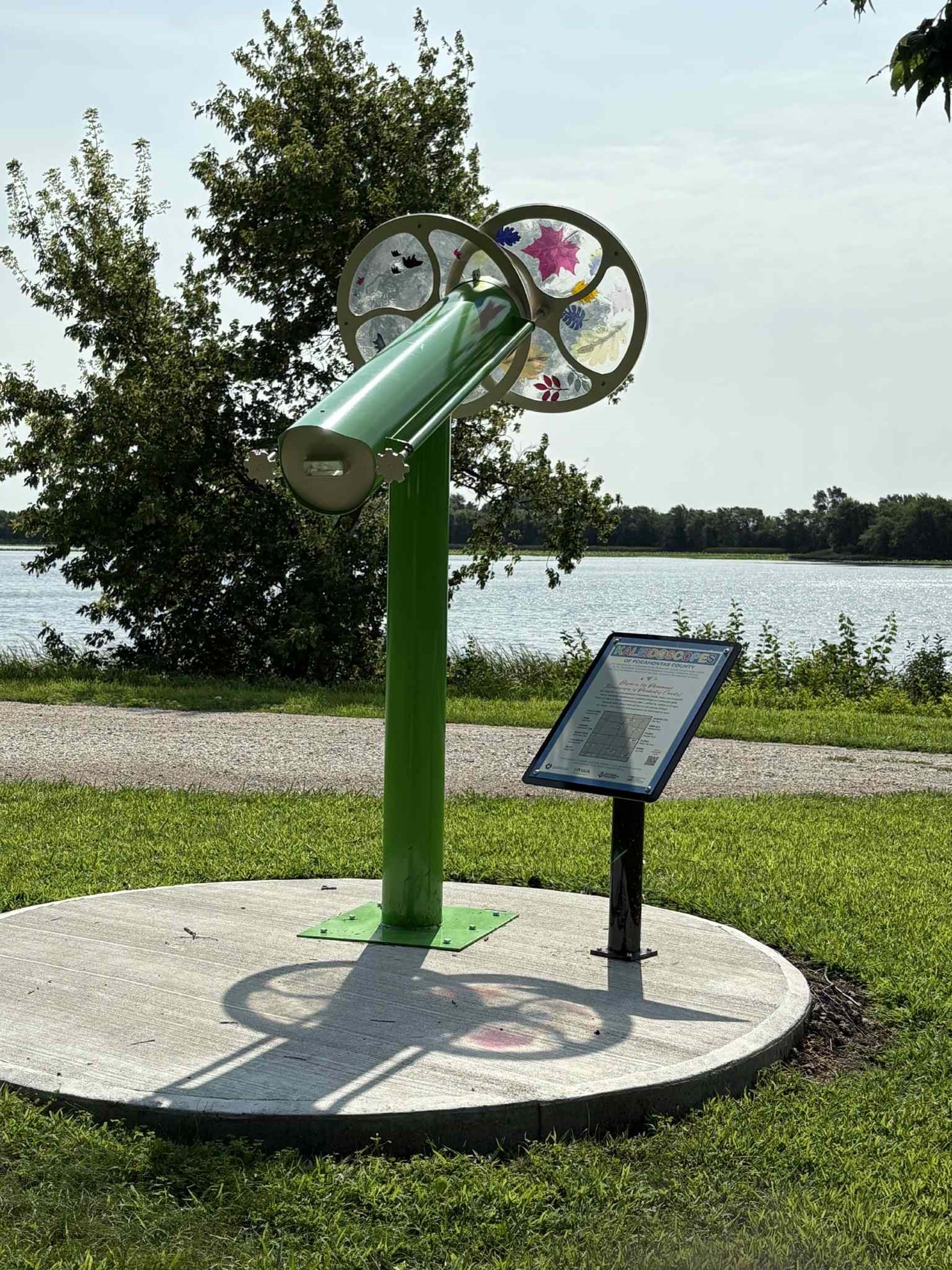 Discover the fascinating kaleidoscopes across Pocahontas County, Iowa! Known as a major tourist attraction for Pocahontas, these 11 kaleidoscopes provide a fun day trip for your family and friends. Each one as different colors to represent the history of the community and a unique design inside. The Little Clear Lake Scope is green and tan to represent the County Conservation colors. It is nestled among the campground and playground equipment at this beautiful county park, which is the perfect place to enjoy kayaking!