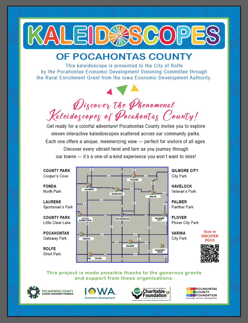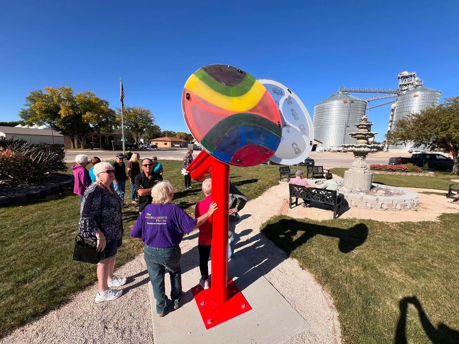 Discover the fascinating kaleidoscopes across Pocahontas County, Iowa! Known as a major tourist attraction for Pocahontas, these 11 kaleidoscopes provide a fun day trip for your family and friends. Each one as different colors to represent the history of the community and a unique design inside. The Pocahontas Scope is red and white in honor of school colors, with one tie-dye wheel and the other wheel featuring fun shapes and objects. It is located at the end of Main Street at Gateway Park, just across the street from Pocahontas Inn & Suites. Spend the morning shopping at the retail stores, enjoying a drink from the coffee or tea shops, or end the day here to catch a movie at the historic Rialto Theatre.