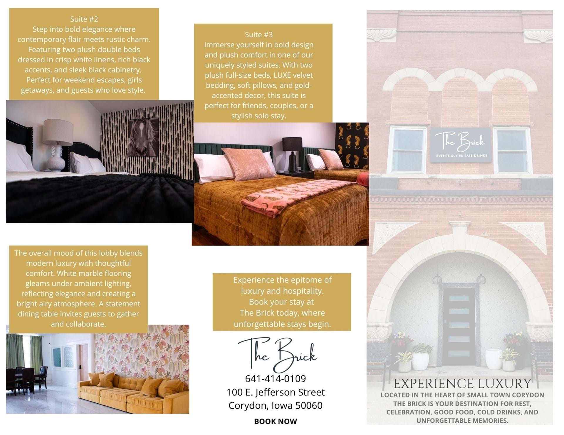 Stay in Style at The Brick Suites. Welcome to comfort, charm, and convenience all under one roof. Whether you’re visiting for a weekend getaway, celebrating a special occasion, or needing a cozy home away from home, The Brick Suites is the perfect choice. Spacious, modern suites with a touch of historic character. Steps away from dining, shopping, and entertainment. Perfect for weddings, family gatherings, and extended stays. Warm hospitality with all the amenities you deserve At The Brick Suites, every stay is designed to feel like more than just a night away—it’s an experience. Book your suite today and discover why guests call us their “home in the heart of town.” The Brick Suites | Comfort. Convenience. Character.