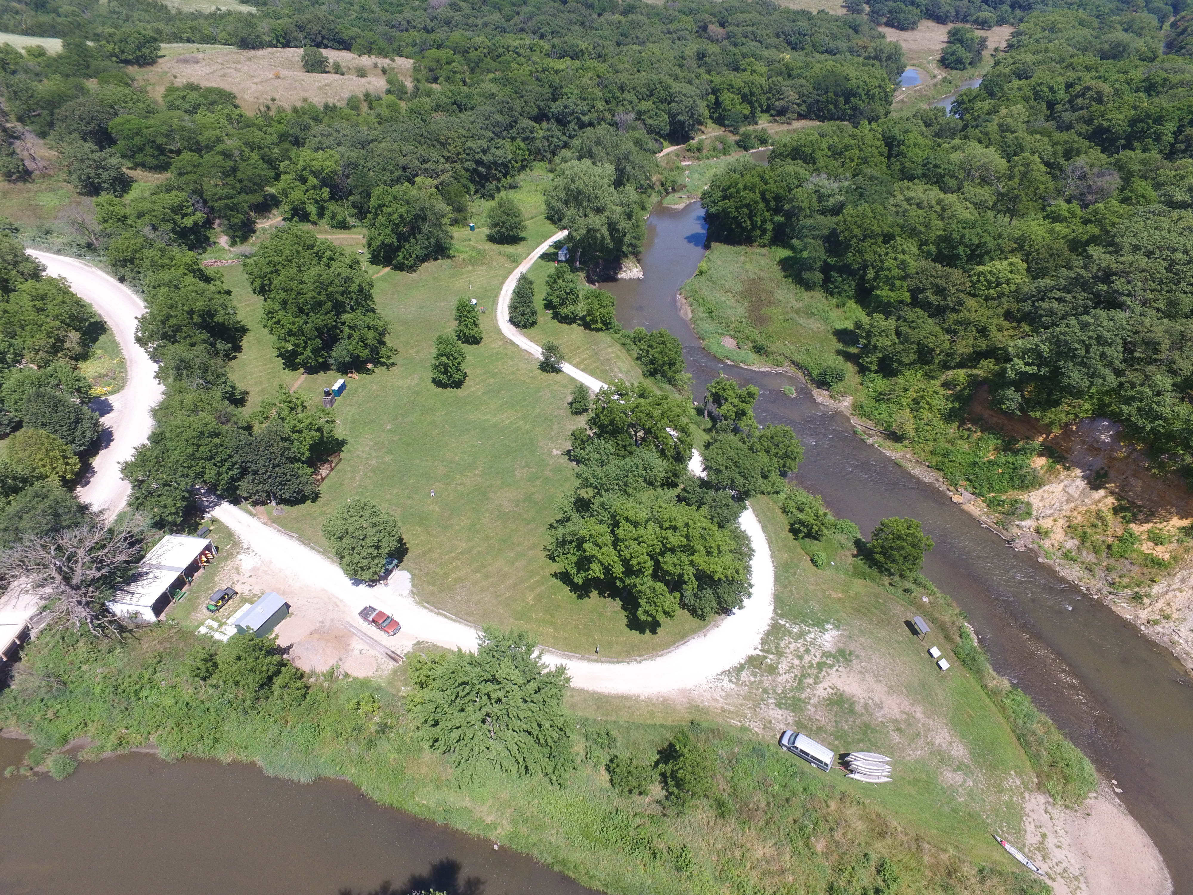 The River Campground, situated in the heart of Whiterock Valley, is a perfect access point for over 40 miles of trails. The campground sits along a bend of the Middle Raccoon River, amid gorgeous sandstone outcroppings and our resident cliff swallow colony. This particular bluff, from which Whiterock derives its name, is the largest vertical outcrop of Cretaceous Dakota Sandstone in the Midwest. Several excellent fishing ponds, trailheads, and a nearby abandoned 1800s log cabin are within hiking distance. Seven campsites, a tent, a camper, and a horse trailer are accessible. Picnic tables & fire rings at each site, Port-a-potties, Solar Shower, Potable water faucet, Horse tie lines, manure pits, and wheelbarrows, Access to single-track, shared use, equestrian, and water trails